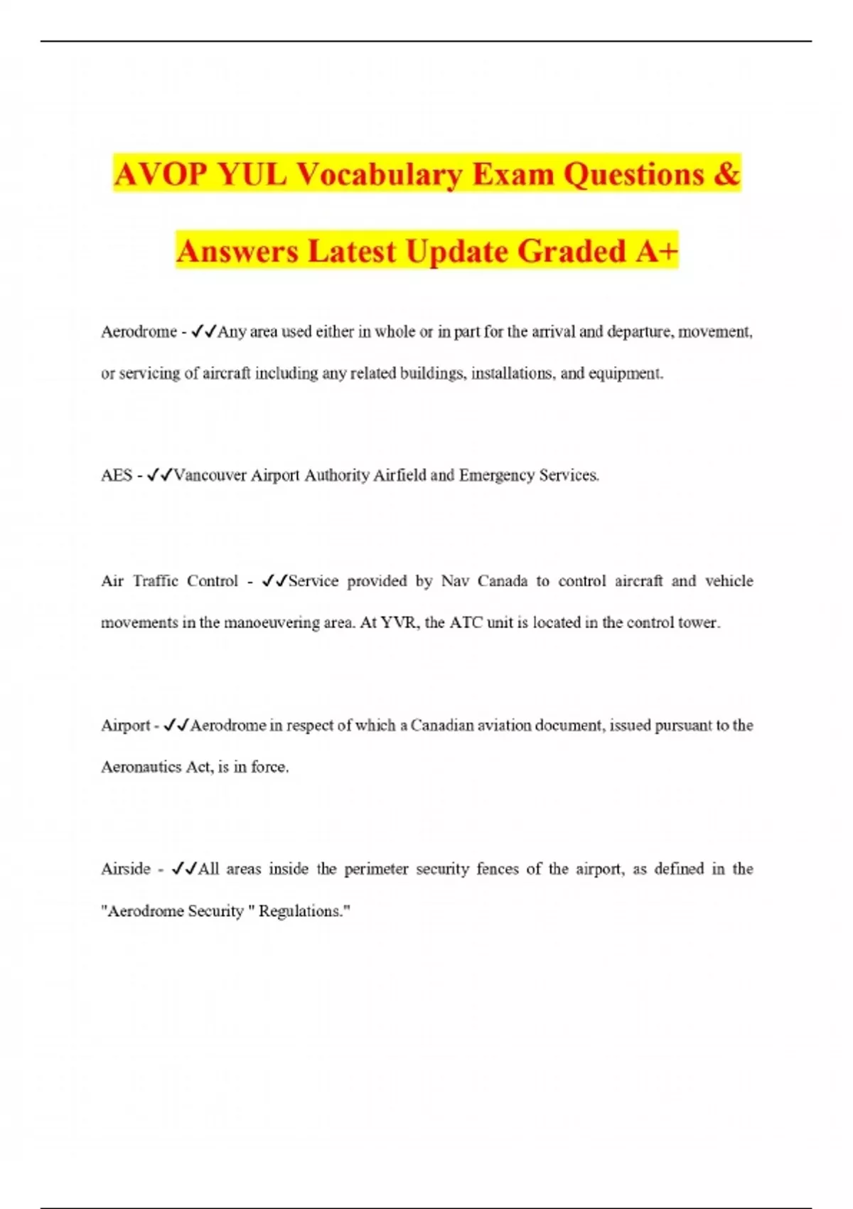 AVOP YUL Vocabulary Exam Questions & Answers Latest Update Graded A+