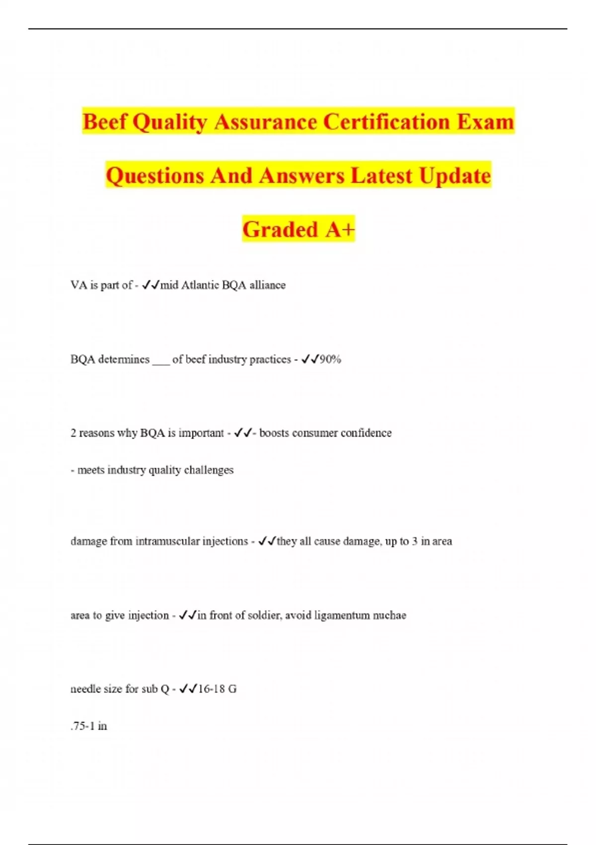 Beef Quality Assurance Certification Exam Questions And Answers Latest Update graded a+