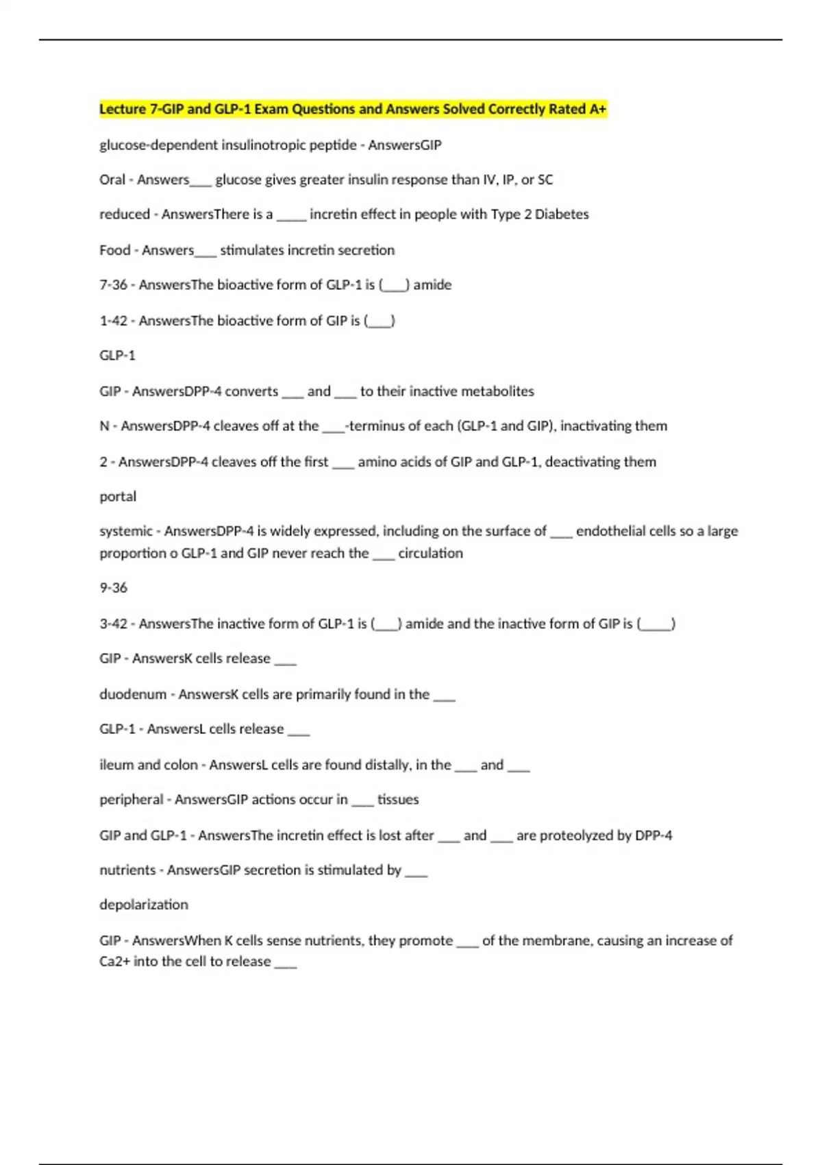 Lecture 7-GIP and GLP-1 Exam Questions and Answers Solved Correctly Rated A+