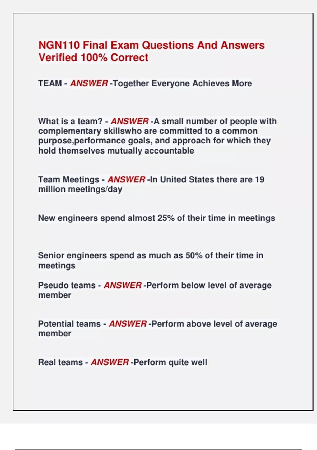 NGN110 Final Exam Questions And Answers Verified 100% Correct TEAM - ANSWER -Together Everyone Achieves More What is a team? - ANSWER -A small number of people with complementary skillswho are committed to a common purpose,performance goals, and approach for which they hold themselves mutually accountable Team Meetings - ANSWER -In United States there are 19 million meetings/day New engineers spend almost 25% of their time in meetings Senior engineers spend as much as 50% of their time in meetings Pseudo teams - ANSWER -Perform below level of average member Potential teams - ANSWER -Perform above level of average member Real teams - ANSWER -Perform quite well High performing teams - ANSWER -Perform to an extraordinary level Team Sponsor - ANSWER -- Translates vision into action - e.g. instructor, manager Team Leader - ANSWER -- Responsible for what is to be accomplished, and how - may run meetings Team Facilitator - ANSWER -- Individual from outside the team - leads discussion; keeps focused and moving - neutral - helps team leader prepare for meeting Team members - ANSWER -- selected due to responsibilities or expertise - contribute info and ideas Meeting coordinator - ANSWER -- prepares - agenda - time and place - resources - keeps code of cooperation - monitors decision making Agenda - ANSWER -done by meeting coordinator includes - meeting place, date, time - roles of members - agenda items (tasks) Code of Cooperation - ANSWER -- guidelines to promote constructive and productive teamwork - agreed upon by all members - visible and accessible to all Recorder - ANSWER -- writing of the team