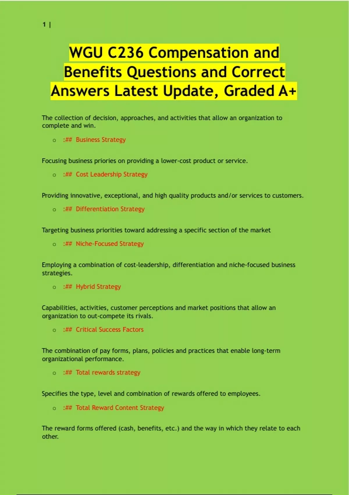 WGU C236 Compensation and Benefits Exam Questions and Correct Answers Latest Update, Graded A+. The collection of decision, approaches, and activities that allow an organization to complete and win. o :## Business Strategy Focusing business priories on providing a lower-cost product or service. o :## Cost Leadership Strategy Providing innovative, exceptional, and high quality products and/or services to customers. o :## Differentiation Strategy Targeting business priorities toward addressing a specific section of the market o :## Niche-Focused Strategy Employing a combination of cost-leadership, differentiation and niche-focused business strategies. o :## Hybrid Strategy Capabilities, activities, customer perceptions and market positions that allow an organization to out-compete its rivals. o :## Critical Success Factors The combination of pay forms, plans, policies and practices that enable long-term organizational performance. o :## Total rewards strategy