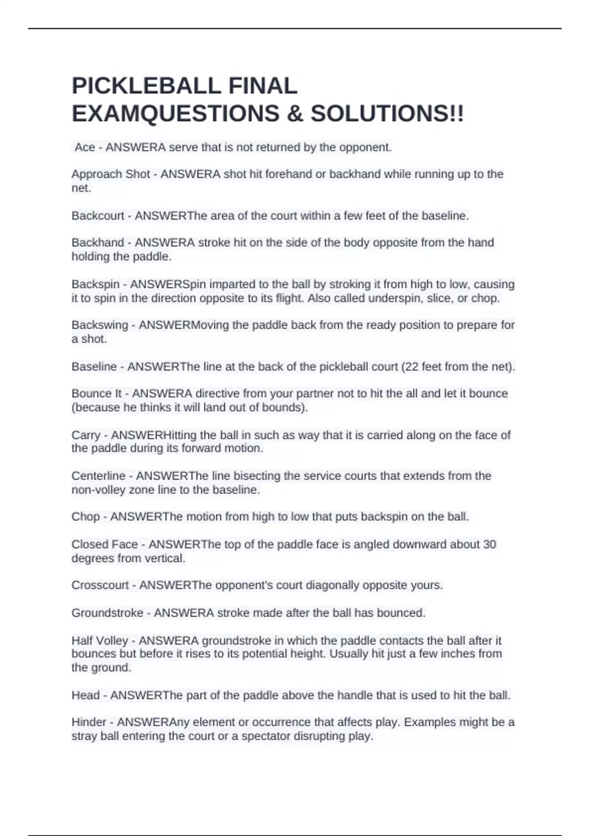 Head - ANSWERThe part of the paddle above the handle that is used to hit the ball.