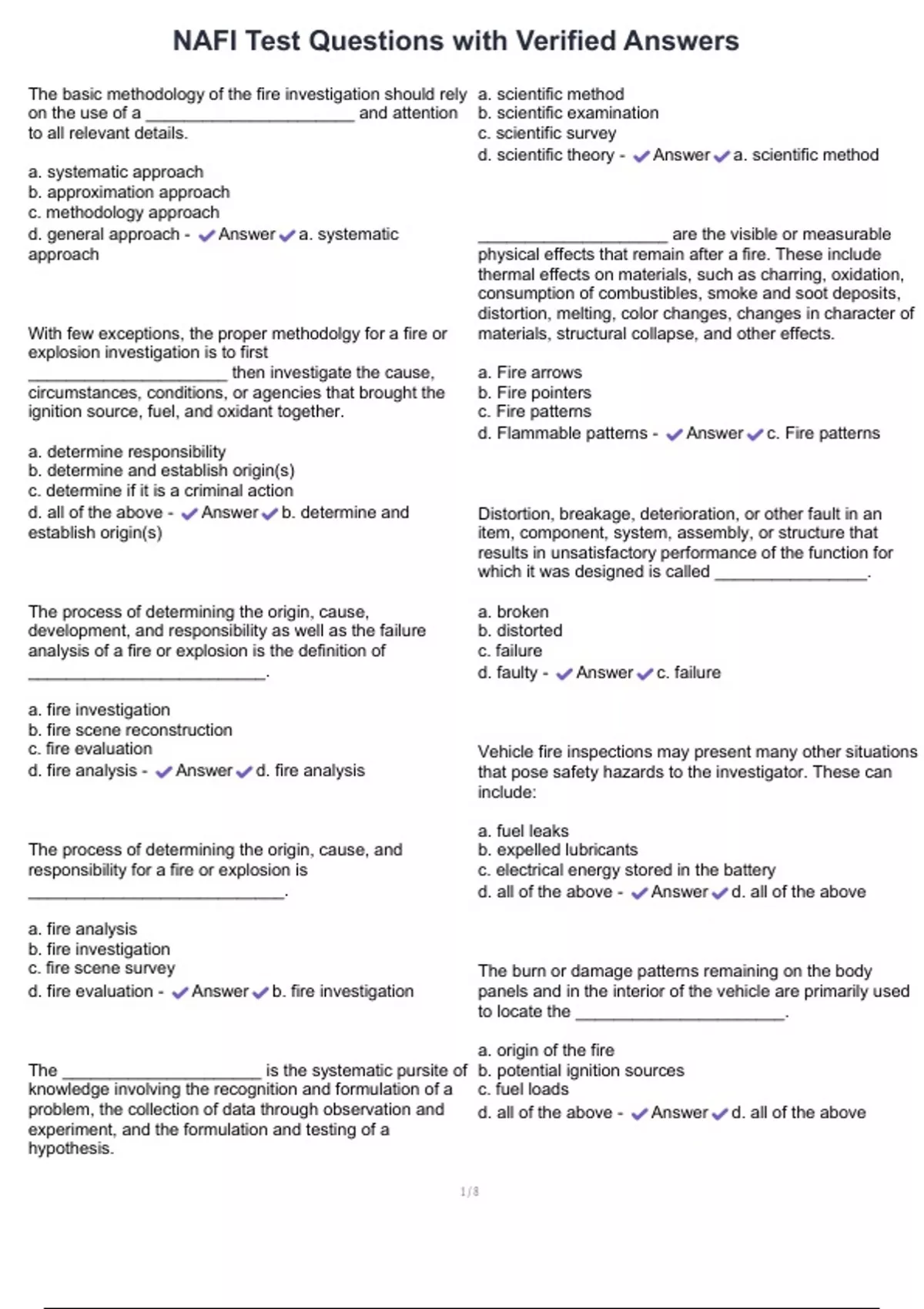 The basic methodology of the fire investigation should rely on the use of a ______________________ and attention to all relevant details. a. systematic approach b. approximation approach c. methodology approach d. general approach - Answer a. systematic approach With few exceptions, the proper methodolgy for a fire or explosion investigation is to first _____________________ then investigate the cause, circumstances, conditions, or agencies that brought the ignition source, fuel, and oxidant together. a. determine responsibility b. determine and establish origin(s) c. determine if it is a criminal action d. all of the above - Answer b. determine and establish origin(s) The process of determining the origin, cause, development, and responsibility as well as the failure analysis of a fire or explosion is the definition of _________________________. a. fire investigation