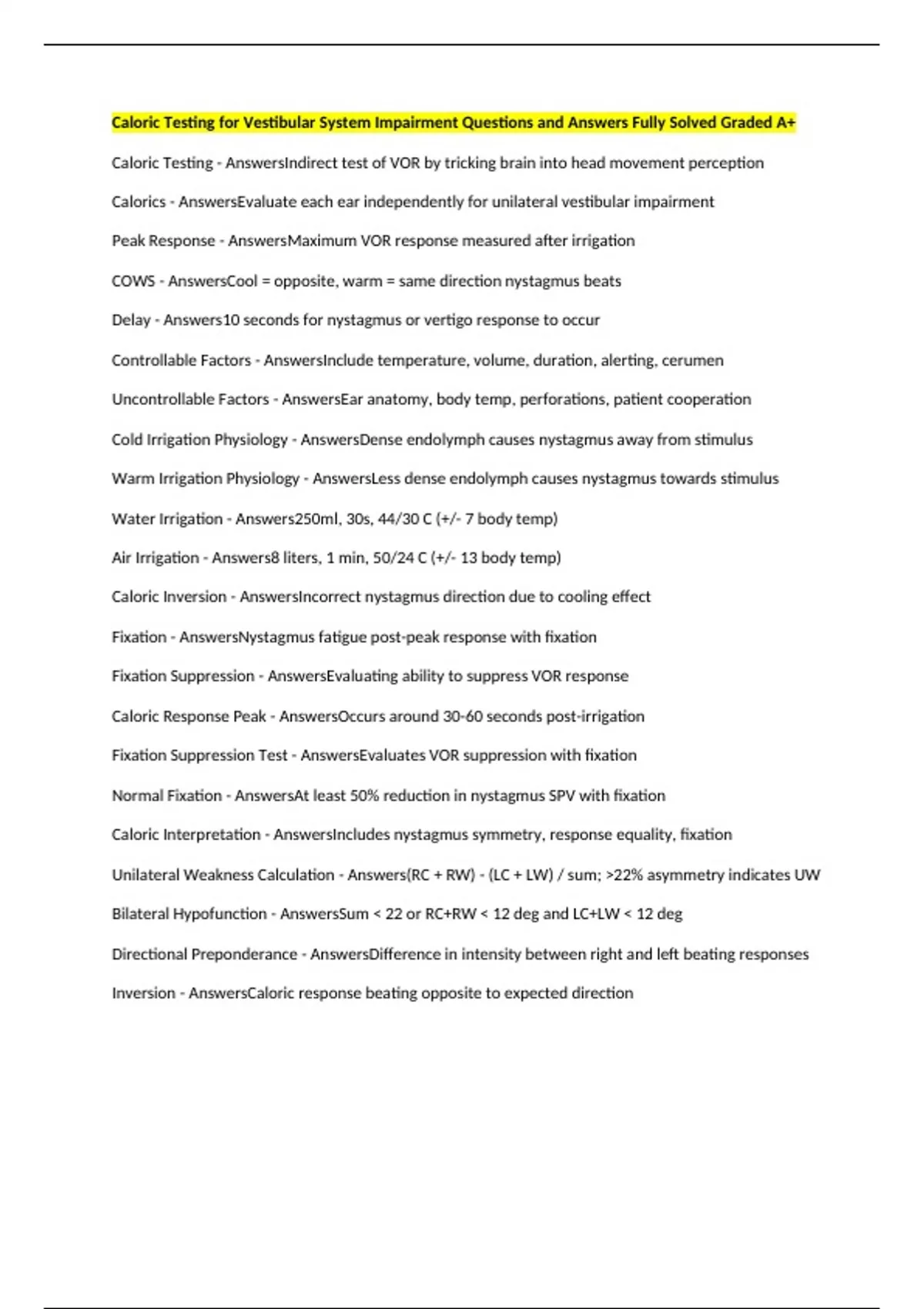 Caloric Testing for Vestibular System Impairment Questions and Answers Fully Solved Graded A+