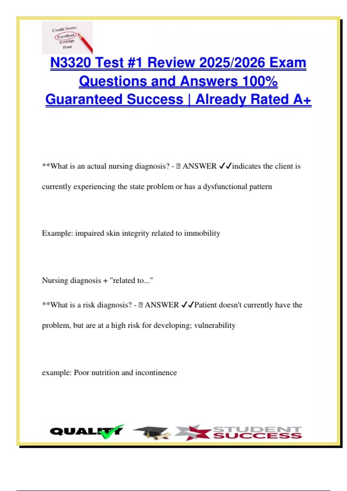This N3320 practice test includes over 90 graded and verified A+ questions and answers tailored for the 2025/2026 academic year. It offers focused preparation on neurological and musculoskeletal assessment skills, including cranial nerve testing (CN I–XII), coordination, gait analysis, reflex exams (Babinski, Brudzinski, DTRs), and key musculoskeletal evaluations (TMJ, spine, ROM). It also addresses reproductive health topics such as STIs (HPV, syphilis, trichomoniasis), vaginal disorders, and genital exam findings. Ideal for BSN, RN, and NCLEX prep students studying adult health, physical assessment, or clinical diagnostics. Keywords: cranial nerves, neurological exam, musculoskeletal system, reflex testing, Romberg sign, Brudzinski reflex, Kernig sign, plantar reflex, gait assessment, TMJ exam, spine evaluation, joint mobility, light touch, vibration sense, stereognosis, STI symptoms, HPV, syphilis, vaginitis, trichomoniasis, bacterial vaginosis, genital inspection, rectocele, cystocele