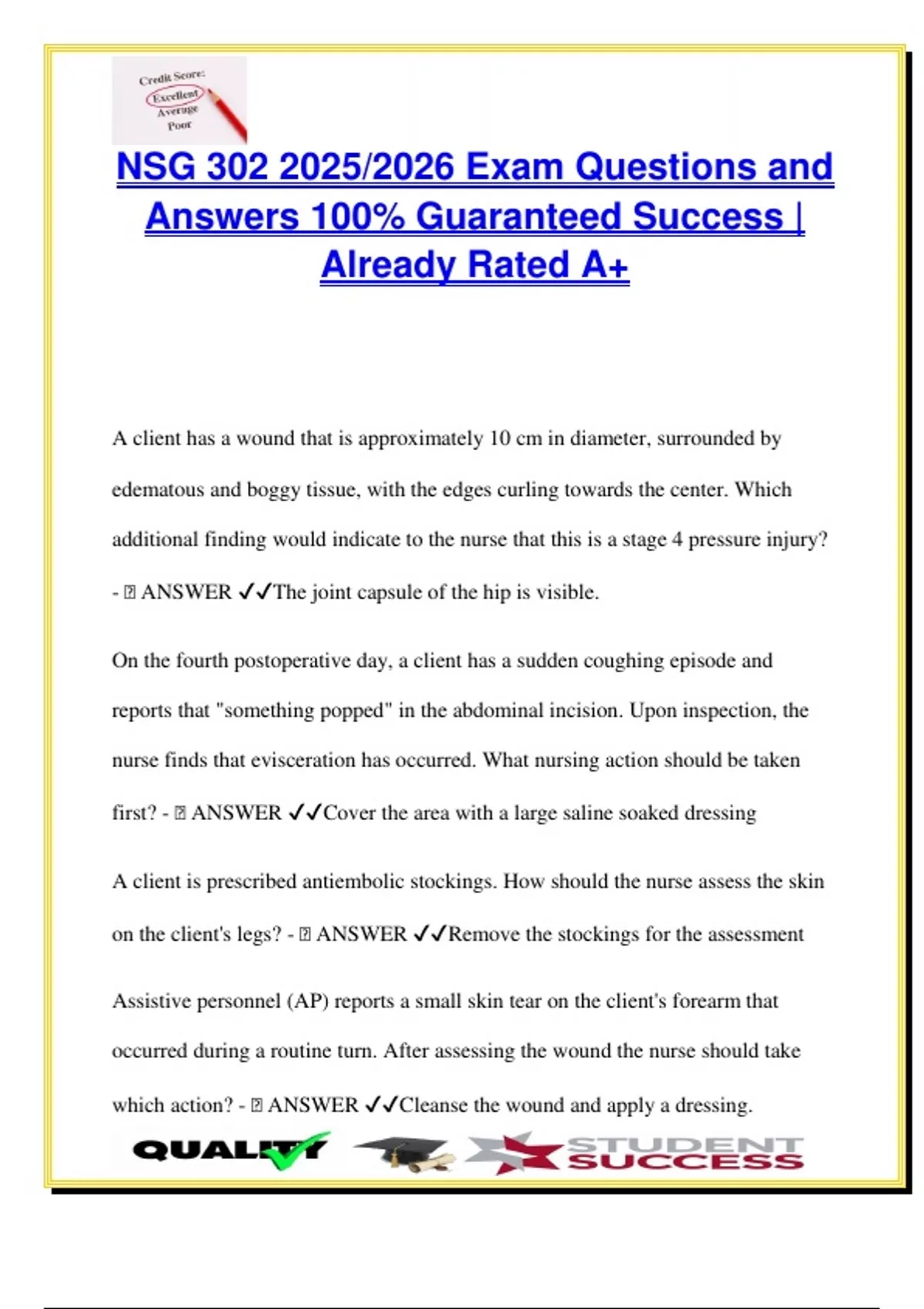 This comprehensive NSG 302 exam guide contains over 120 verified and high-quality questions with answers, ideal for the 2025/2026 academic year. It covers critical nursing topics including wound care (stages, dressings, healing types), pressure injuries, burns, skin infections, cellulitis, psoriasis, and stomatitis. Musculoskeletal and respiratory care content includes osteoporosis, fractures, obstructive sleep apnea, COPD, asthma, and post-op hip precautions. Also features GI and GU assessments like peptic ulcers, constipation, BPH, and urinalysis interpretation. Perfect for BSN, RN, and LPN students focusing on adult health, fundamentals of nursing, and NCLEX preparation. Keywords: pressure injuries, wound healing, evisceration care, Braden scale, skin tear treatment, burn classification, psoriasis, cellulitis, osteomyelitis, osteoporosis, fracture care, COPD, asthma, obstructive sleep apnea, ABG interpretation, nasogastric tube, BPH, constipation, urinary assessment, GI bleed, peptic ulcer, stomatitis, Crohn's disease, urinalysis, infection control, patient safety
