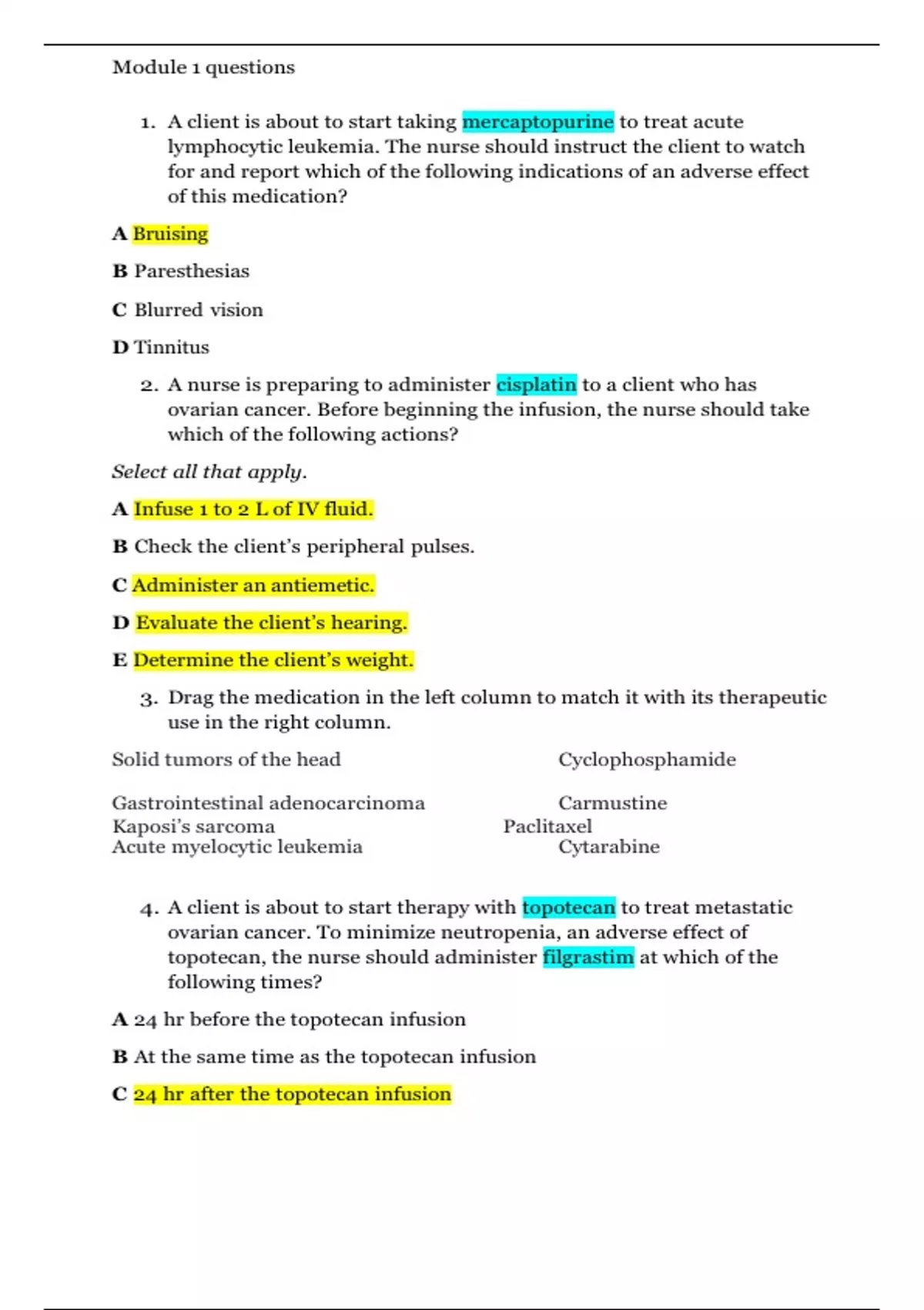 NUR 213- Module 1 questions and answers, 100% correct; updated 2025. 1. A client is about to start taking mercaptopurine to treat acute lymphocytic leukemia. The nurse should instruct the client to watch for and report which of the following indications of an adverse effect of this medication? A Bruising B Paresthesias C Blurred vision D Tinnitus 2. A nurse is preparing to administer cisplatin to a client who has ovarian cancer. Before beginning the infusion, the nurse should take which of the following actions? Select all that apply. A Infuse 1 to 2 L of IV fluid. B Check the client’s peripheral pulses. C Administer an antiemetic. D Evaluate the client’s hearing. E Determine the client’s weight. 3. Drag the medication in the left column to match it with its therapeutic use in the right column. Solid tumors of the head Cyclophosphamide Gastrointestinal adenocarcinoma Carmustine Kaposi’s sarcoma Paclitaxel Acute myelocytic leukemia Cytarabine 4. A client is about to start therapy with topotecan to treat metastatic ovarian cancer. To minimize neutropenia, an adverse effect of topotecan, the nurse should administer filgrastim at which of the following times? A 24 hr before the topotecan infusion B At the same time as the topotecan infusion C 24 hr after the topotecan infusion D 1 hr before the topotecan infusion 5. The nurse should instruct a client who is taking tamoxifen to treat breast cancer to watch for and report which of the following serious adverse effects of this medication? A Abnormal menstrual bleeding B Muscle pain and weakness C Yellowing of skin and eyes D Peripheral edema 6. While administering trastuzumab IV to a client who has breast cancer, the nurse should ensure that they have which of the following medications available to treat an adverse reaction to this medication? A Protamine B Epinephrine C Glucagon D Atropine 7. The nurse is assessing a client who is receiving imatinib to treat chronic myeloid leukemia. Which of the following findings might indicate an adverse reaction to this medication? A Bradycardia B Dry mouth C Constricted pupils D Crackles at lung bases 8. The nurse is caring for a client who is pregnant and HIV-positive. Which of the following medications help prevent the transfer of HIV to the fetus? A Anastrozole B Zidovudine C Tamoxifen D Trastuzumab 9. Drag the medication in the left column to match it with its therapeutic use in the right column. Tamoxifen Estrogen-receptor-positive breast cancer Flutamide Prostate cancer Enfuvirtide Advanced or resistant HIV disease Efavirenz HIV-1 infection 10. A client is about to start taking ritonavir to treat HIV-1 infection. Which of the following instructions should the nurse include when talking with the client about taking this medication? Select all that apply. A Expect periodic blood glucose testing. B Take it on an empty stomach. C Watch for and report jaundice. D Increase weight-bearing activity. E Expect periodic cholesterol testing. 11. Match the organism in the left column with its type in the right column. Candida albicans Fungus Staphylococcus aureus Aerobic bacteria Trichomonas Parasite Varicella zoster Virus 12. A client is prescribed amoxicillin to treat an ear infection. The health care provider instructs the client to monitor and report which of the following? A Rash B Blurred vision C Peripheral edema D Insomnia 13. Imipenem should be used with caution in clients who have which of the following conditions? A Seizure disorder B Thyroid disease C Diabetes D Immunosuppression 14. A client is prescribed oral tetracycline for the treatment of acne vulgaris. When instructing the client about the tetracycline, which of the following information should the provider include? Select all that apply. A Increase weight-bearing activity. B Report mouth pain. C Take 1 hr before meals. D Wear sunscreen and protective clothing. E Swallow pill with 8 oz of milk. 15. A client is prescribed gentamicin for treatment of a respiratory tract infection. The provider instructs the client to monitor and report which of the following adverse effects of gentamicin? A Blurred vision B Tremor C Sweating D Tinnitus 16. A client is prescribed trimethoprim/sulfamethoxazole for treatment of a urinary tract infection. The health care provider should instruct the client to monitor and report which of the following that may indicate a serious adverse effect of trimethoprim/sulfamethoxazole. A Blurred vision B Sore throat C Insomnia D Swelling in calf 17. A client is prescribed rifampin for the treatment of tuberculosis. The health care provider should instruct the client to monitor and report which of the following that may indicate a serious adverse effect of the rifampin. A Tremor B Jaundice C Sweating D Insomnia 18. A client is prescribed itraconazole for the treatment of systemic mycoses. The provider should include which of the following information when instructing the client about the administration of itraconazole? Select all that apply. A Take with food to reduce gastric distress. B Take in the morning to avoid insomnia. C Take with 8 oz of acidic liquid, like cola or orange juice, to increase absorption. D Take with an antacid to reduce dyspepsia. E Increase fluid intake to 2 to 3 L/day if tolerated. 19. Which of the following interventions may prevent a serious adverse reaction to acyclovir? A Premedicate with a nonsteroidal inflammatory medication. B Ambulate after infusion. C Increase fluid intake. D Remain flat for 2 hr after infusion. 20. Match the pharmacologic term in the left column with a therapeutic use in the right column. Drag the options on the left to their match on the right (or match pairs by first selecting the option on the left and then selecting its match on the right). 21. Match the pharmacologic term in the left column with a therapeutic use in the right column. Drag the options on the left to their match on the right (or match pairs by first selecting the option on the left and then selecti