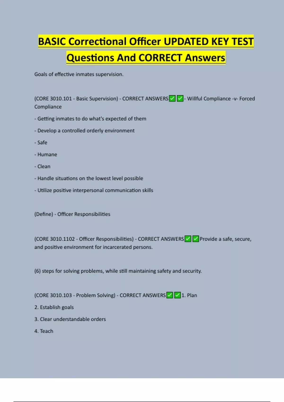 BASIC Correctional Officer UPDATED KEY TEST Questions And CORRECT Answers Goals of effective inmates supervision. (CORE 3010.101 - Basic Supervision) - CORRECT ANSWERS Compliance - Getting inmates to do what's expected of them - Develop a controlled orderly environment - Safe - Humane - Clean - Handle situations on the lowest level possible - Utilize positive interpersonal communication skills (Define) - Officer Responsibilities (CORE 3010.1102 - Officer Responsibilities) - CORRECT ANSWERS and positive environment for incarcerated persons. - Willful Compliance -v- Forced Provide a safe, secure, (6) steps for solving problems, while still maintaining safety and security. (CORE 3010.103 - Problem Solving) - CORRECT ANSWERS 2. Establish goals 3. Clear understandable orders 4. Teach