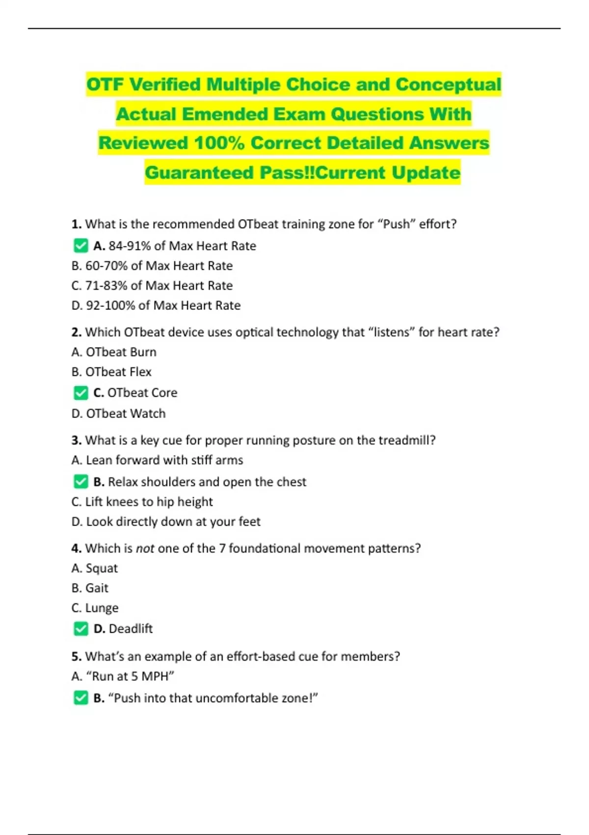 OTF Verified Multiple Choice and Conceptual Actual Emended Exam Questions With Reviewed 100% Correct Detailed Answers Guaranteed Pass!!Current Update 1. What is the recommended OTbeat training zone for “Push” effort? A. 84-91% of Max Heart Rate B. 60-70% of Max Heart Rate C. 71-83% of Max Heart Rate D. 92-100% of Max Heart Rate 2. Which OTbeat device uses optical technology that “listens” for heart rate? A. OTbeat Burn B. OTbeat Flex C. OTbeat Core D. OTbeat Watch 3. What is a key cue for proper running posture on the treadmill? A. Lean forward with stiff arms B. Relax shoulders and open the chest C. Lift knees to hip height D. Look directly down at your feet 4. Which is not one of the 7 foundational movement patterns? A. Squat B. Gait C. Lunge D. Deadlift 5. What’s an example of an effort-based cue for members? A. “Run at 5 MPH” B. “Push into that uncomfortable zone!” C. “Use 15-pound dumbbells” D. “Hit 250 watts on the rower” 6. What defines the “Base Pace” for treadmill running? A. All-out effort B. Challenging but sustainable C. Maximum sprint D. Walking recovery