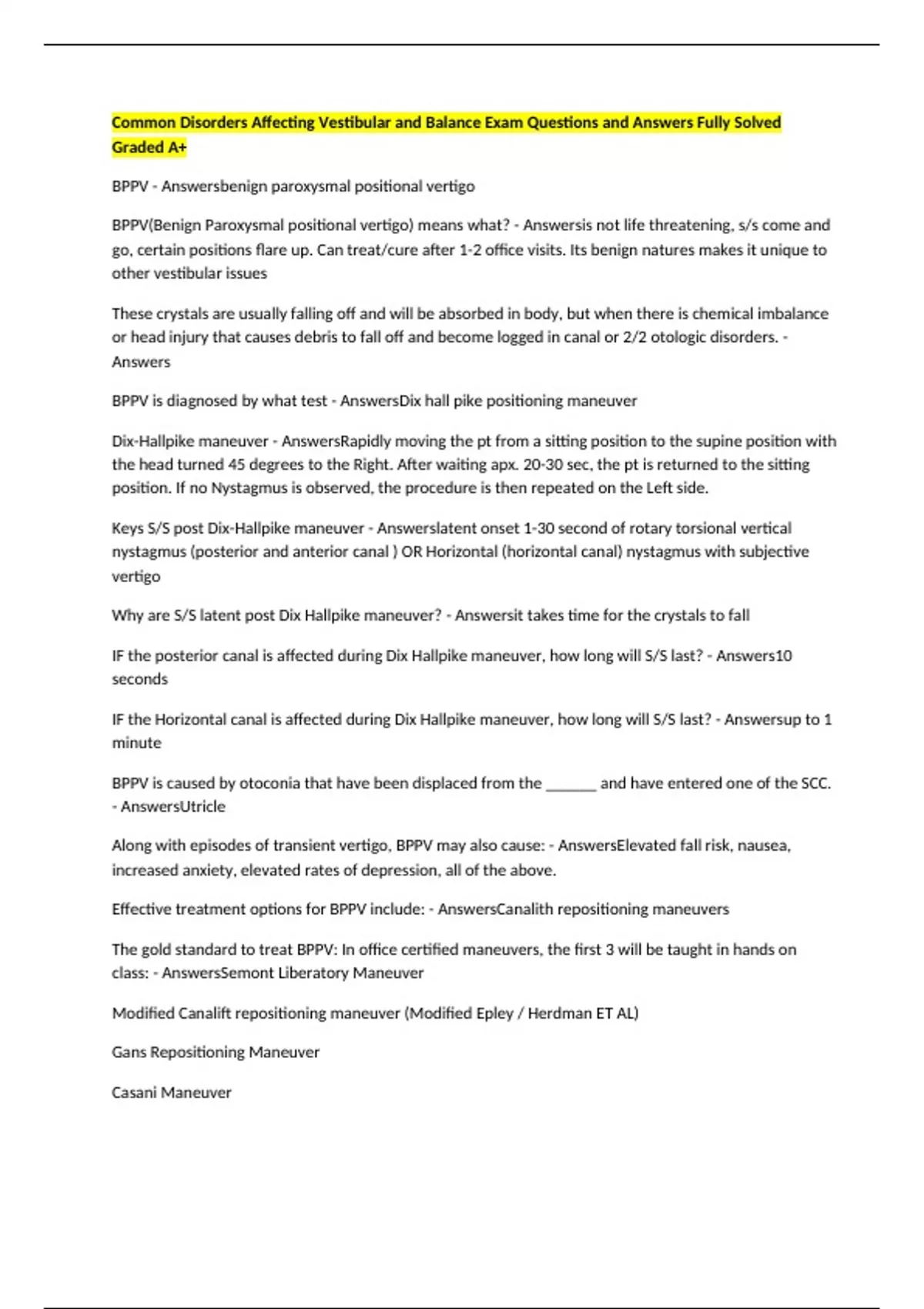 Common Disorders Affecting Vestibular and Balance Exam Questions and Answers Fully Solved Graded A+ BPPV - Answersbenign paroxysmal positional vertigo BPPV(Benign Paroxysmal positional vertigo) means what? - Answersis not life threatening, s/s come and go, certain positions flare up. Can treat/cure after 1-2 office visits. Its benign natures makes it unique to other vestibular issues These crystals are usually falling off and will be absorbed in body, but when there is chemical imbalance or head injury that causes debris to fall off and become logged in canal or 2/2 otologic disorders. - Answers BPPV is diagnosed by what test - AnswersDix hall pike positioning maneuver Dix-Hallpike maneuver - AnswersRapidly moving the pt from a sitting position to the supine position with the head turned 45 degrees to the Right. After waiting apx. 20-30 sec, the pt is returned to the sitting position. If no Nystagmus is observed, the procedure is then repeated on the Left side. Keys S/S post Dix-Hallpike maneuver - Answerslatent onset 1-30 second of rotary torsional vertical nystagmus (posterior and anterior canal ) OR Horizontal (horizontal canal) nystagmus with subjective vertigo Why are S/S latent post Dix Hallpike maneuver? - Answersit takes time for the crystals to fall IF the posterior canal is affected during Dix Hallpike maneuver, how long will S/S last? - Answers10 seconds IF the Horizontal canal is affected during Dix Hallpike maneuver, how long will S/S last? - Answersup to 1 minute BPPV is caused by otoconia that have been displaced from the ______ and have entered one of the SCC. - AnswersUtricle Along with episodes of transient vertigo, BPPV may also cause: - AnswersElevated fall risk, nausea, increased anxiety, elevated rates of depression, all of the above. Effective treatment options for BPPV include: - AnswersCanalith repositioning maneuvers The gold standard to treat BPPV: In office certified maneuvers, the first 3 will be taught in hands on class: - AnswersSemont Liberatory Maneuver Modified Canalift repositioning maneuver (Modified Epley / Herdman ET AL) Gans Repositioning Maneuver Casani Maneuver Appiani Maneuver Horizontal Hybrid maneuver BBQ/Logroll Maneuver Name 3 tests we will review to treat BPPV - Answers-Semont Liberatory Maneuver -Modified Canalift repositioning maneuver (Modified Epley / Herdman ET AL) -Gans Repositioning Maneuve Canalithiasis - AnswersVariant of BPPV where otoconia are free floating within the semicircular canal If Right or left horizontal SCC is affected, what type of nystagmus will be present - AnswersHorizontal Nystagmus Name Systemic non-otological factors associated with BPPV - Answers-Cardiovascular disease- impedance of blood flow affects debris that will get into the SCC; -Head Trauma- more likely to be multi SCC, more challenging, more likely bilaterally; Migraine- thought to cause issues with ion channels which are in the ear too, Stroke- causes blood flow disturbances How does Vitamin D factors associate with BPPV - Answerscrystals are made of calcium bicarbonate and Vit D helps fluid system absorb calcium so if dysregulation