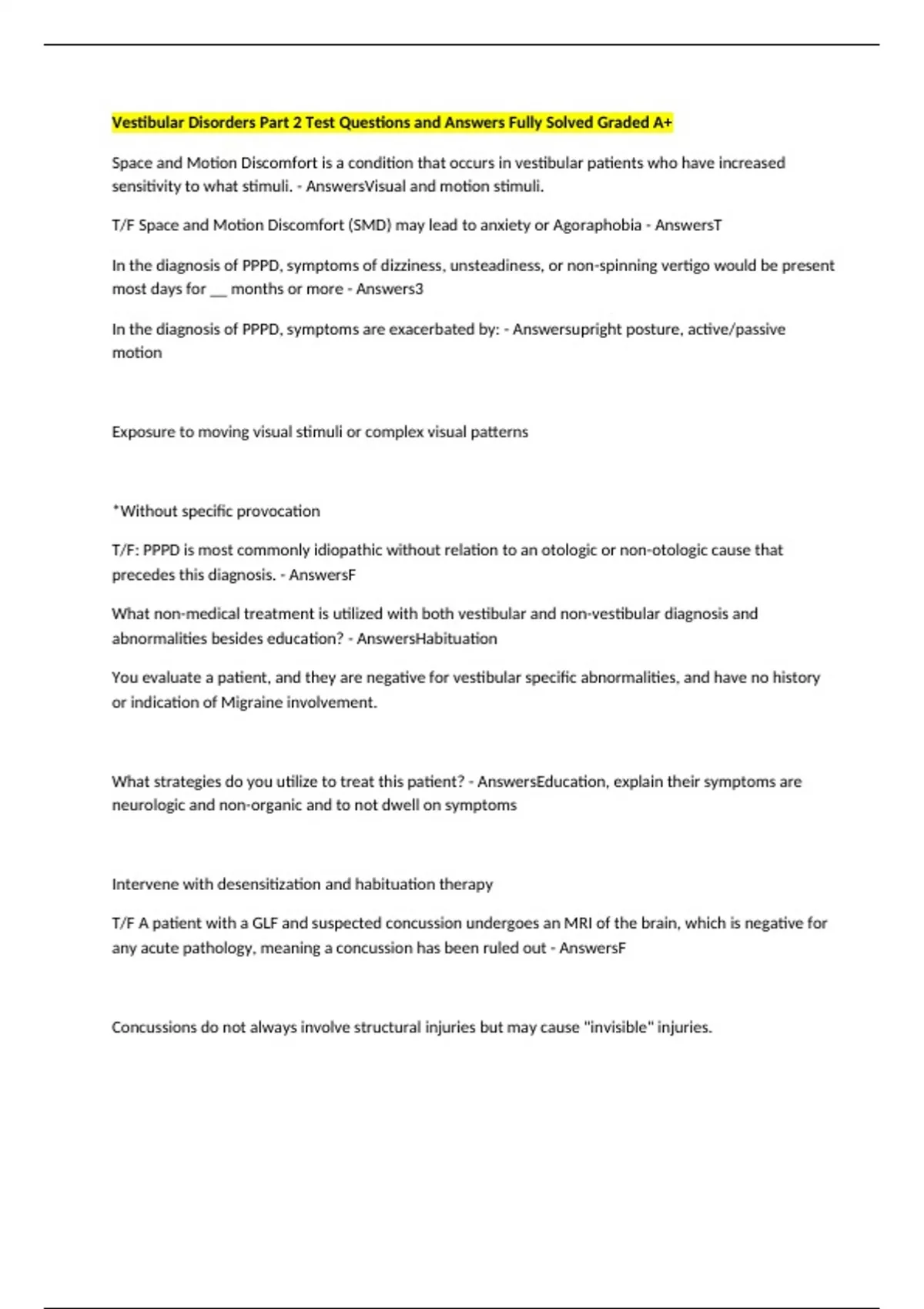Vestibular Disorders Part 2 Test Questions and Answers Fully Solved Graded A+ Space and Motion Discomfort is a condition that occurs in vestibular patients who have increased sensitivity to what stimuli. - AnswersVisual and motion stimuli. T/F Space and Motion Discomfort (SMD) may lead to anxiety or Agoraphobia - AnswersT In the diagnosis of PPPD, symptoms of dizziness, unsteadiness, or non-spinning vertigo would be present most days for __ months or more - Answers3 In the diagnosis of PPPD, symptoms are exacerbated by: - Answersupright posture, active/passive motion Exposure to moving visual stimuli or complex visual patterns *Without specific provocation T/F: PPPD is most commonly idiopathic without relation to an otologic or non-otologic cause that precedes this diagnosis. - AnswersF What non-medical treatment is utilized with both vestibular and non-vestibular diagnosis and abnormalities besides education? - AnswersHabituation You evaluate a patient, and they are negative for vestibular specific abnormalities, and have no history or indication of Migraine involvement. What strategies do you utilize to treat this patient? - AnswersEducation, explain their symptoms are neurologic and non-organic and to not dwell on symptoms Intervene with desensitization and habituation therapy T/F A patient with a GLF and suspected concussion undergoes an MRI of the brain, which is negative for any acute pathology, meaning a concussion has been ruled out - AnswersF Concussions do not always involve structural injuries but may cause "invisible" injuries. You evaluate a patient who suffered a fall with head trauma at home. Imaging is negative for central pathology. They have severe vertiginous symptoms but are also negative for BPPV and