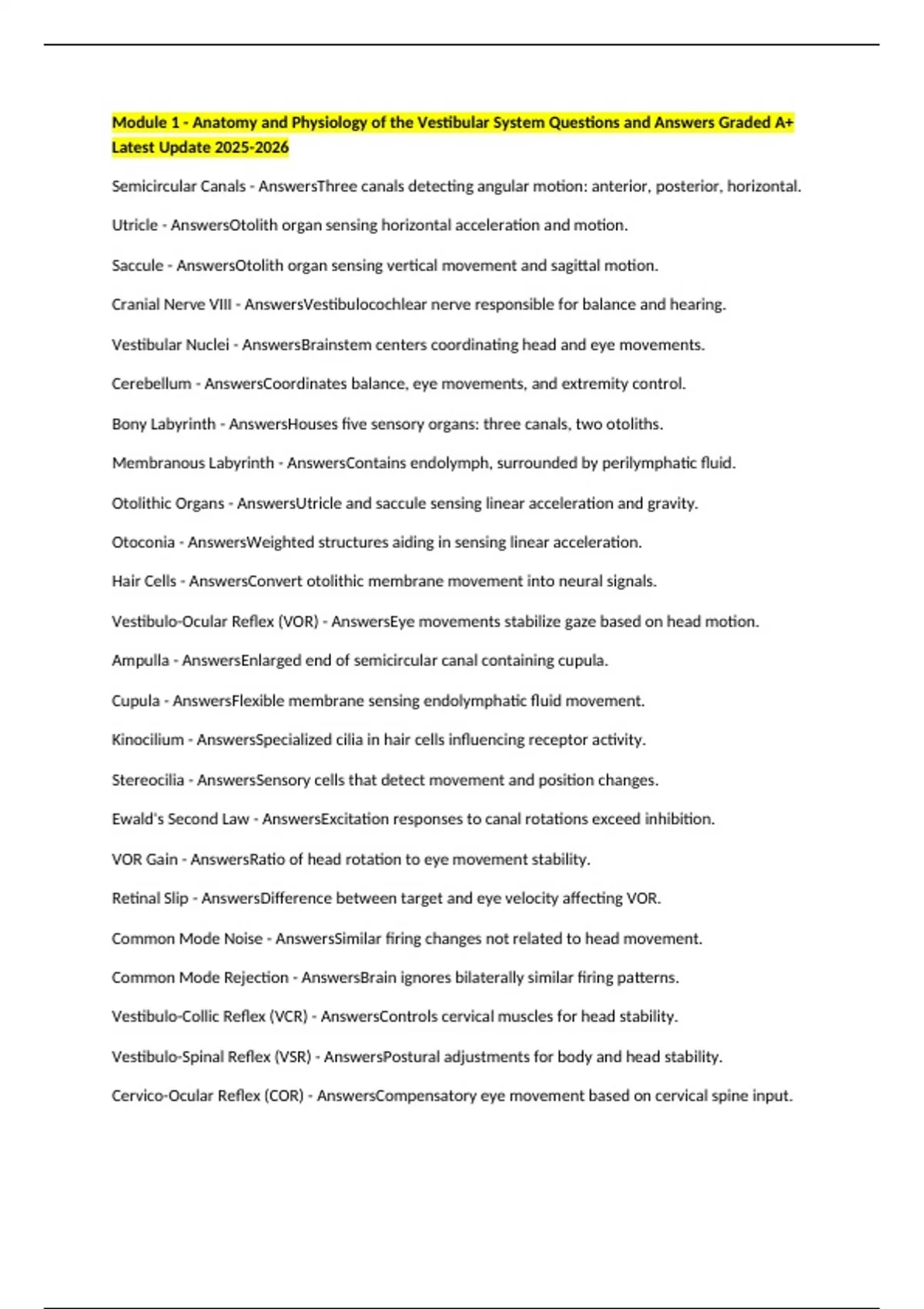 Module 1 - Anatomy and Physiology of the Vestibular System Questions and Answers Graded A+ Latest Update Semicircular Canals - AnswersThree canals detecting angular motion: anterior, posterior, horizontal. Utricle - AnswersOtolith organ sensing horizontal acceleration and motion. Saccule - AnswersOtolith organ sensing vertical movement and sagittal motion. Cranial Nerve VIII - AnswersVestibulocochlear nerve responsible for balance and hearing. Vestibular Nuclei - AnswersBrainstem centers coordinating head and eye movements. Cerebellum - AnswersCoordinates balance, eye movements, and extremity control. Bony Labyrinth - AnswersHouses five sensory organs: three canals, two otoliths. Membranous Labyrinth - AnswersContains endolymph, surrounded by perilymphatic fluid. Otolithic Organs - AnswersUtricle and saccule sensing linear acceleration and gravity. Otoconia - AnswersWeighted structures aiding in sensing linear acceleration. Hair Cells - AnswersConvert otolithic membrane movement into neural signals. Vestibulo-Ocular Reflex (VOR) - AnswersEye movements stabilize gaze based on head motion. Ampulla - AnswersEnlarged end of semicircular canal containing cupula. Cupula - AnswersFlexible membrane sensing endolymphatic fluid movement. Kinocilium - AnswersSpecialized cilia in hair cells influencing receptor activity. Stereocilia - AnswersSensory cells that detect movement and position changes. Ewald's Second Law - AnswersExcitation responses to canal rotations exceed inhibition. VOR Gain - AnswersRatio of head rotation to eye movement stability. Retinal Slip - AnswersDifference between target and eye velocity affecting VOR. Common Mode Noise - AnswersSimilar firing changes not related to head movement. Common Mode Rejection - AnswersBrain ignores bilaterally similar firing patterns. Vestibulo-Collic Reflex (VCR) - AnswersControls cervical muscles for head stability. Vestibulo-Spinal Reflex (VSR) - AnswersPostural adjustments for body and head stability. Cervico-Ocular Reflex (COR) - AnswersCompe