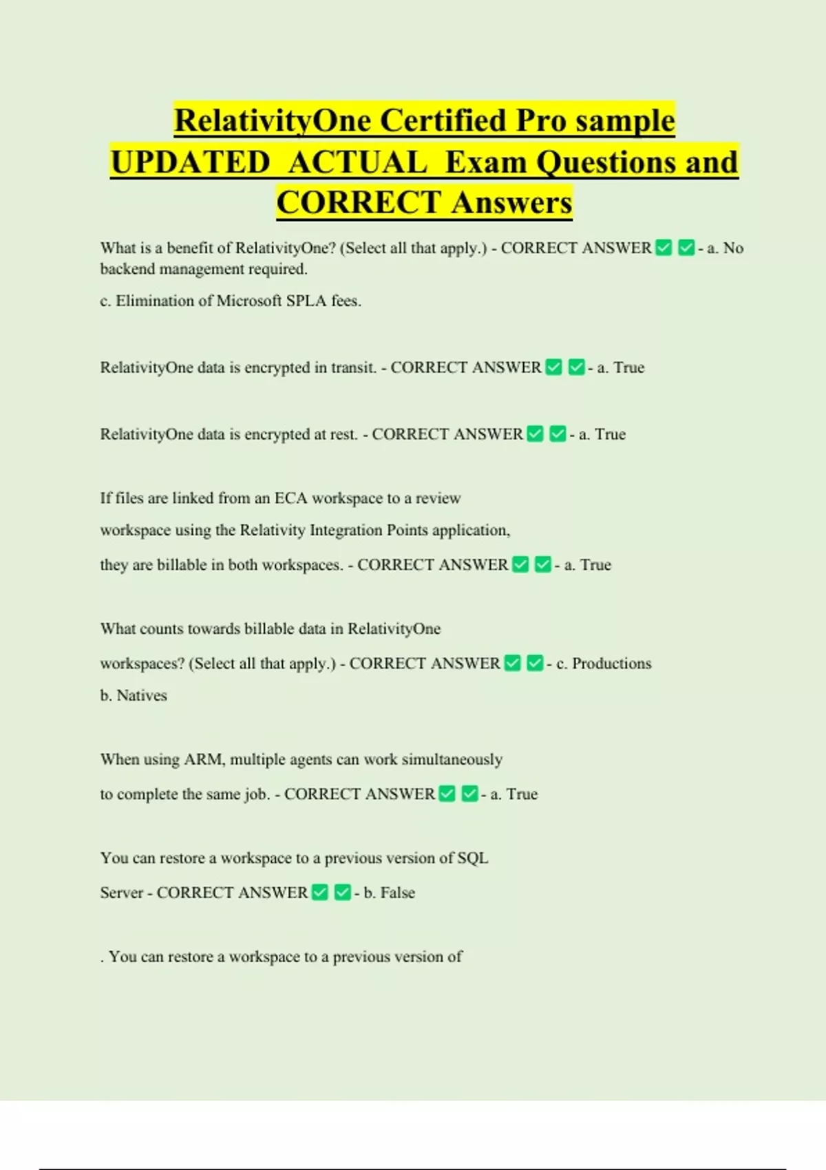 RelativityOne Certified Pro sample UPDATED ACTUAL Exam Questions and CORRECT Answers What is a benefit of RelativityOne? (Select all that apply.) - CORRECT ANSWER backend management required. c. Elimination of Microsoft SPLA fees. RelativityOne data is encrypted in transit. - CORRECT ANSWER RelativityOne data is encrypted at rest. - CORRECT ANSWER If files are linked from an ECA workspace to a review workspace using the Relativity Integration Points application, they are billable in both workspaces. - CORRECT ANSWER What counts towards billable data in RelativityOne workspaces? (Select all that apply.) - CORRECT ANSWER b. Natives When using ARM, multiple agents can work simultaneously to complete the same job. - CORRECT ANSWER You can restore a workspace to a previous version of SQL Server - CORRECT ANSWER - b. False . You can restore a workspace to a previous version of - a. True
