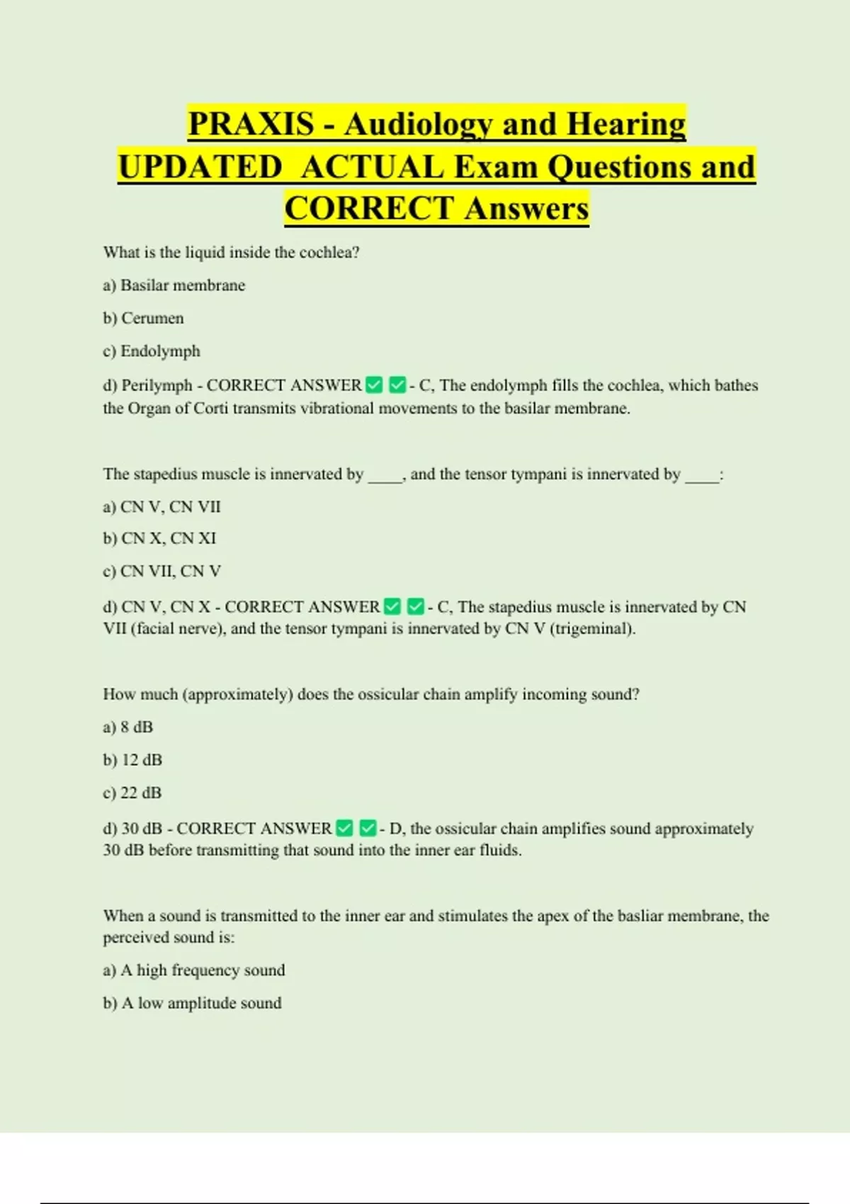 d) 30 dB - CORRECT ANSWER - D, the ossicular chain amplifies sound approximately