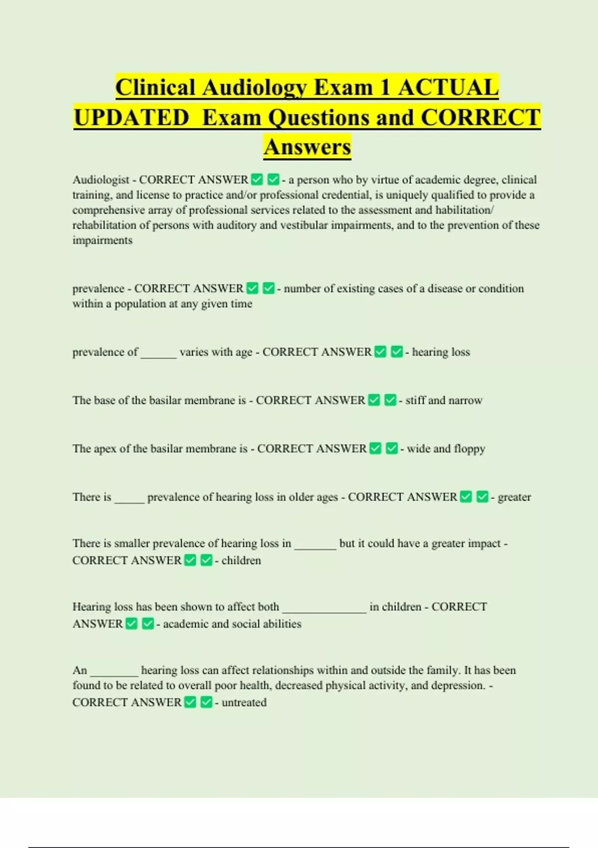 Clinical Audiology Exam 1 ACTUAL UPDATED Exam Questions and CORRECT Answers Audiologist - CORRECT ANSWER - a person who by virtue of academic degree, clinical training, and license to practice and/or professional credential, is uniquely qualified to provide a comprehensive array of professional services related to the assessment and habilitation/ rehabilitation of persons with auditory and vestibular impairments, and to the prevention of these impairments prevalence - CORRECT ANSWER within a population at any given time - number of existing cases of a disease or condi