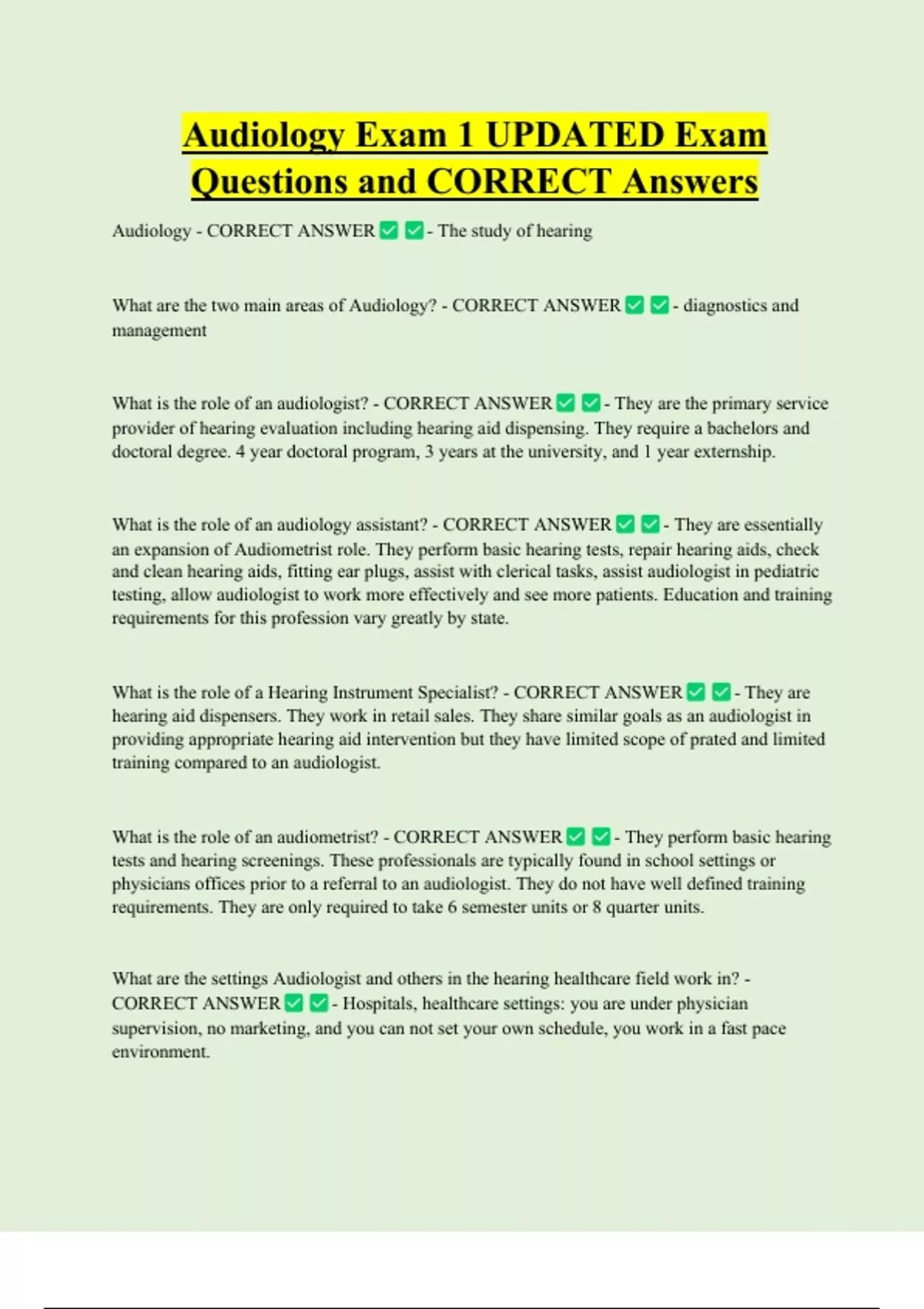 Audiology Exam 1 UPDATED Exam Questions and CORRECT Answers Audiology - CORRECT ANSWER - The study of hearing What are the two main areas of Audiology? - CORRECT ANSWER management What is the role of an audiologist? - CORRECT ANSWER - diagnostics and - They are the primary service provider of hearing evaluation including hearing aid dispensing. They require a bachelors and doctoral degree. 4 year doctoral program, 3 years at the university, and 1 year externship.