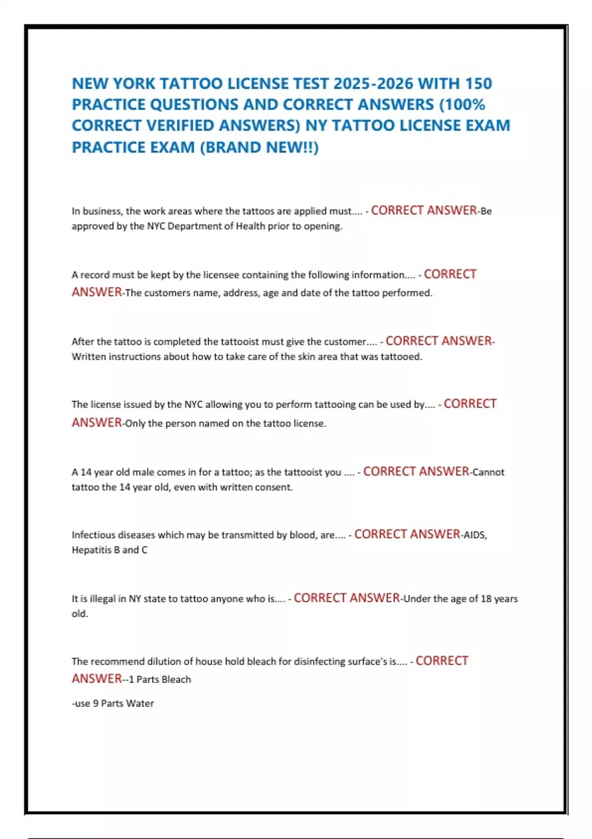 NEW YORK TATTOO LICENSE TEST WITH 150 PRACTICE QUESTIONS AND CORRECT ANSWERS (100% CORRECT VERIFIED ANSWERS) NY TATTOO LICENSE EXAM PRACTICE EXAM (BRAND NEW!!)