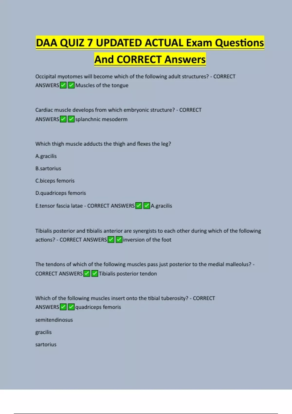 DAA QUIZ 7 UPDATED ACTUAL Exam Questions And CORRECT Answers Occipital myotomes will become which of the following adult structures? - CORRECT ANSWERS Muscles of the tongue Cardiac muscle develops from which embryonic structure? - CORRECT ANSWERS splanchnic mesoderm Which thigh muscle adducts the thigh and flexes the leg? A.gracilis B.sartorius C.biceps femoris D.quadriceps femoris E.tensor fascia latae - CORRECT ANSWERS A.gracilis Tibialis posterior and tibialis anterior are synergists to each other during which of the following actions? - CORRECT ANSWERS inversion of the foot The tendons of which of the following muscles pass just posterior to the medial malleolus? - CORRECT ANSWERS Tibialis posterior tendon