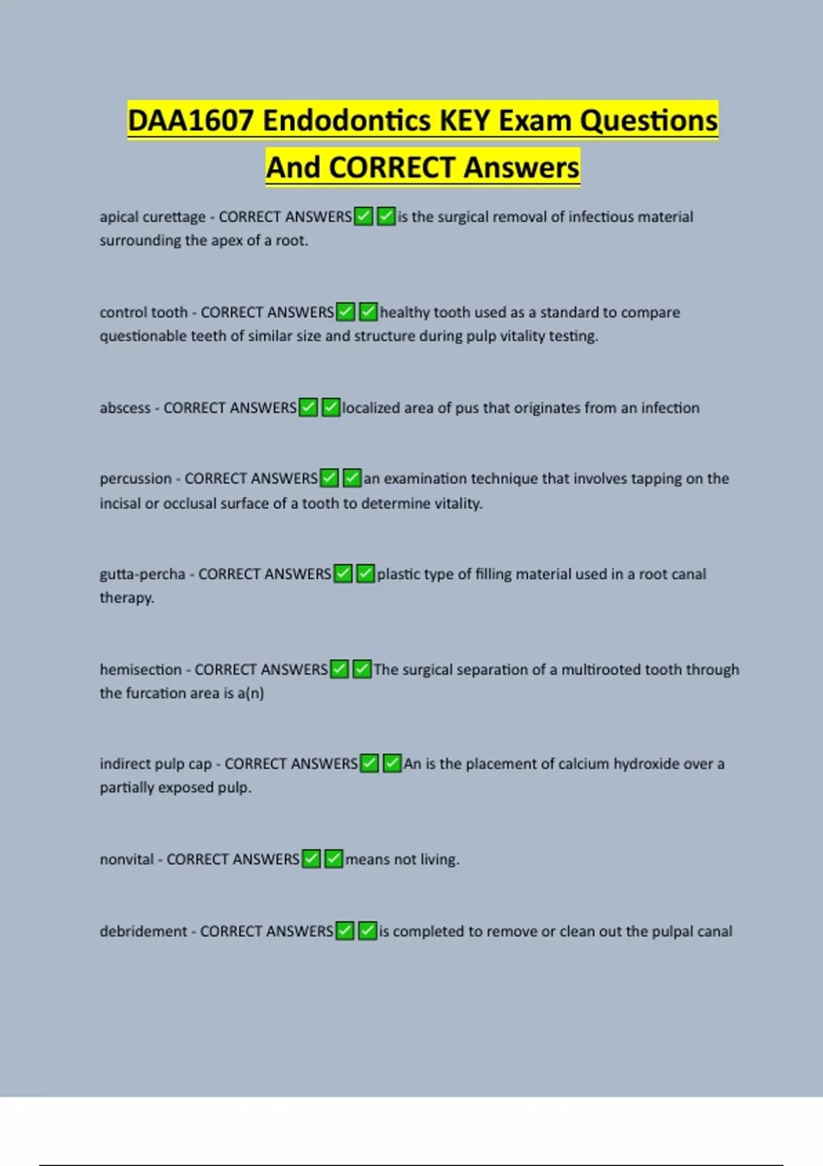 DAA1607 Endodontics KEY Exam Questions And CORRECT Answers apical curettage - CORRECT ANSWERS surrounding the apex of a root. control tooth - CORRECT ANSWERS is the surgical removal of infectious material healthy tooth used as a standard to compare questionable teeth of similar size and structure during pulp vitality testing. abscess - CORRECT ANSWERS percussion - CORRECT ANSWERS localized area of pus that originates from an infection an examination technique that involves tapping on the incisal or occlusal surface of a tooth to determine vitality. gutta-percha - CORRECT ANSWERS therapy. hemisection - CORRECT ANSWERS the furcation area is a(n)