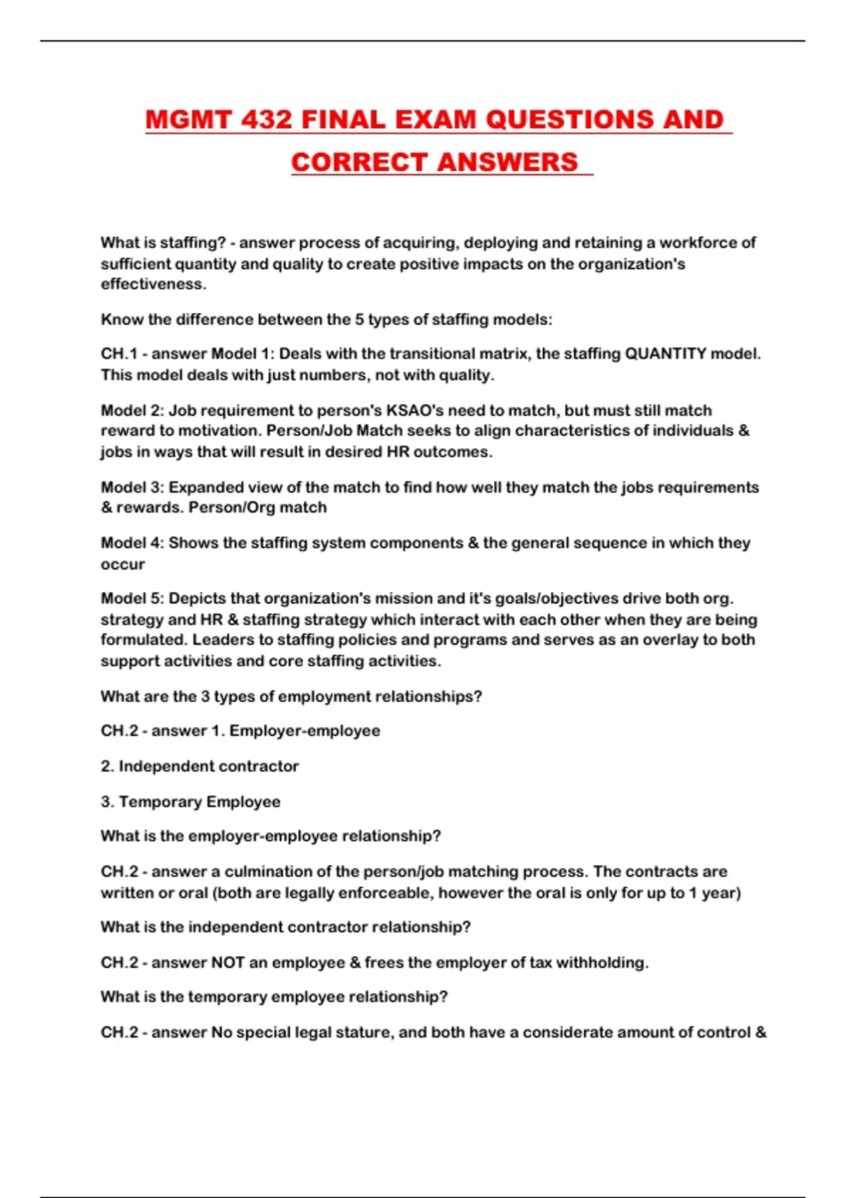 MGMT 432 FINAL EXAM QUESTIONS AND