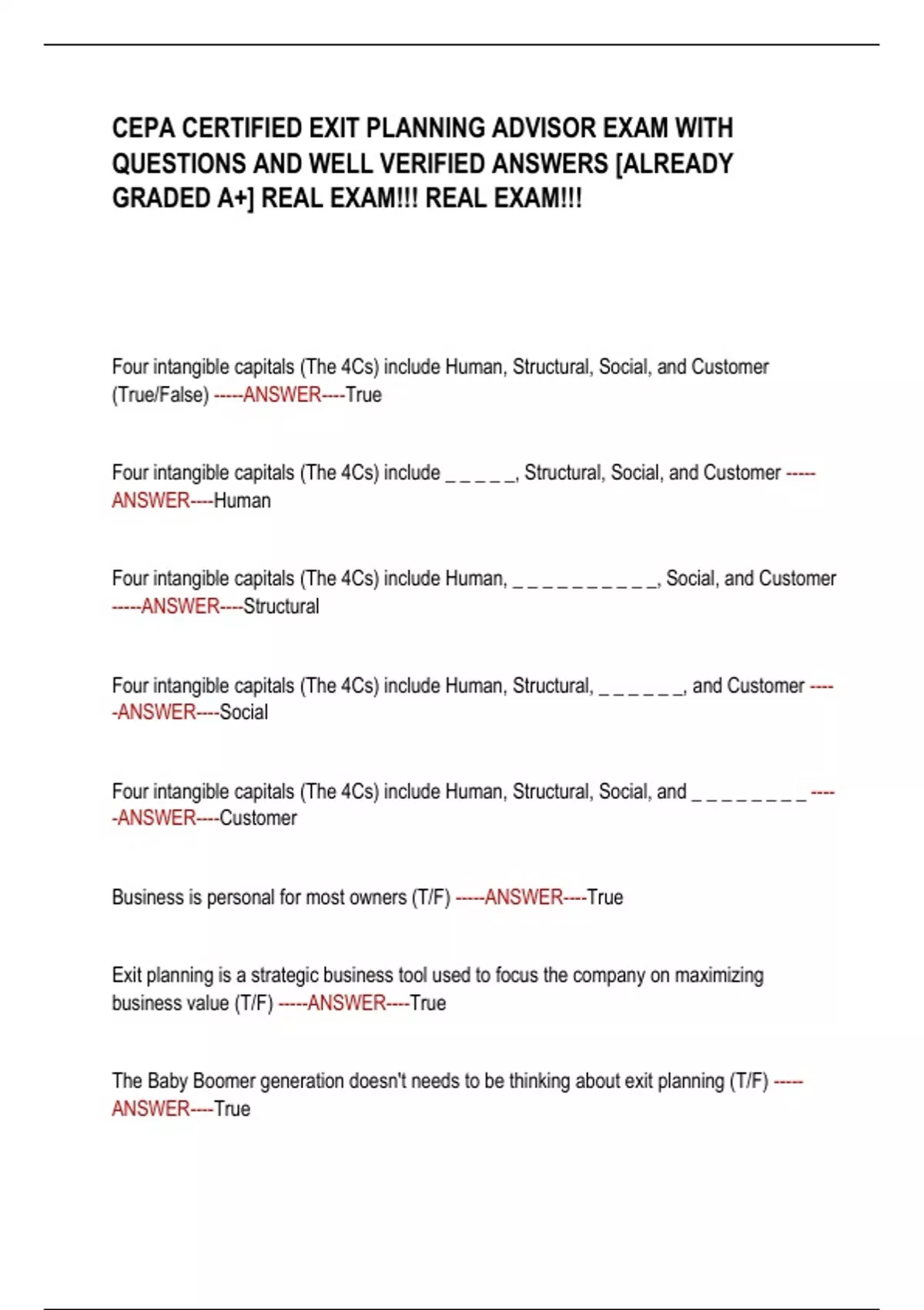 The Baby Boomer generation doesn't needs to be thinking about exit planning (T/F) -----