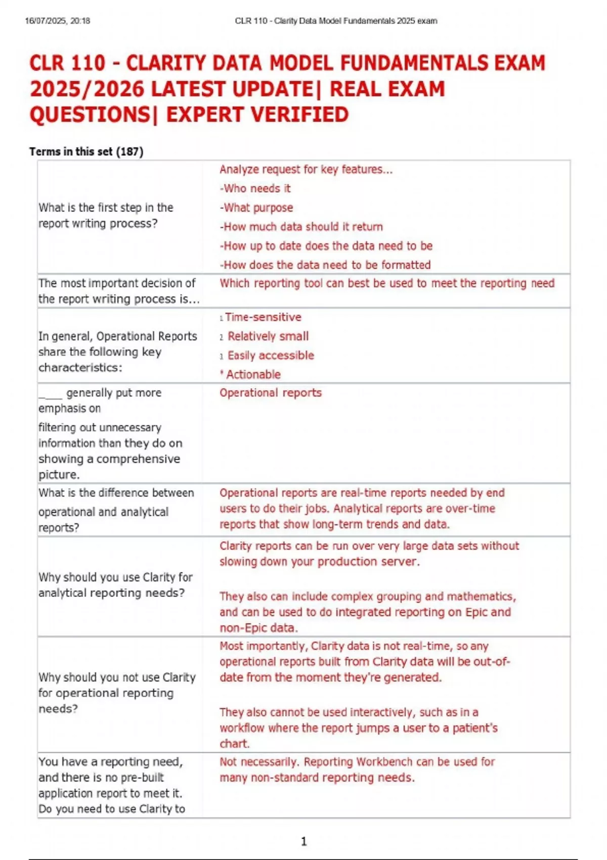 Terms in this set (187) What is the first step in the report writing process? Analyze request for key features... -Who needs it -What purpose -How much data should it return -How up to date does the data need to be -How does the data need to be formatted The most important decision of the report writing process is... Which reporting tool can best be used to meet the reporting need In general, Operational Reports share the following key characteristics: 1. Time-sensitive 2. Relatively small 3. Easily accessible * Actionable _ ___ generally put more emphasis on filtering out unnecessary information than they do on showing a comprehensive picture. Operational reports What is the difference between operational and analytical reports? Operational reports are real-time reports needed by end users to do their jobs. Analytical reports are over-time reports that show long-term trends and data. Why should you use Clarity for analytical reporting needs? Clarity reports can be run over very large data sets without slowing down your production server. They also can include complex grouping and mathematics, and can be used to do integrated reporting on Epic and non-Epic data. Why should you not use Clarity for operational reporting needs? Most importantly, Clarity data is not real-time, so any operational reports built from Clarity data will be out-of date from the moment they're generated. They also cannot be used interactively, such as in a workflow where the report jumps a user to a patient's chart. You have a reporting need, and there is no pre-built application report to meet it. Do you need to use Clarity to Not necessarily. Reporting Workbench can be used for many non-standard reporting needs. 16/07/2025, 20:18 CLR 110 - Clarity Data Model Fundamentals 2025 exam 2 meet this need? Would the following report be an operational or analytical report? Create a report that counts the number of logs each surgeon has been documented as performing in during the past year. Display the log ID, the name of the surgeon, and the log's primary procedure. Analytical report The report should display all patient encounters where the patient was less than 18 years old at the time of the encounter. The report should be grouped by the primary visit provider, and then by patient. Visits without a visit provider should be excluded. For each provider, the report should show the provider's name. For each patient, the report should show the patient's name, primary MRN, and sex. For each encounter, the report should show the date of the encounter, the patient's age at the time of the encounter, and the patient's weight at the time of the encounter. Is this report operational or analytical? Analytical. Time frame for this report is unclear If the requester followed up saying that the report would only be run for the last five days, the report could be considered operational. 16/07/2025, 20:18 CLR 110 - Clarity Data Model Fundamentals 2025 exam 3 The report should display all patient encounters where the patient was less than 18 years old at the time of the encounter. The report should be grouped by the primary visit provider, and then by patient. Visits without a visit provider should be excluded. For each provider, the report should show the provider's name. For each patient, the report should show the patient's name, primary MRN, and sex. For each encounter, the report should show the date of the encounter, the patient's age at the time of the encounter, and the patient's weight at the time of the encounter. What reporting tool would you use to create this report? Crystal Reports. Operational or Analytical? Surgical procedures conducted over the past year, by physician Analytical Operational or Analytical? Pending departmental transfers Operational Operational or Analytical? Wait times for patients currently in the ED Operational Operational or Analytical? Top 100 Chief Complaints in the ED Analytical 16/07/2025, 20:18 CLR 110 - Clarity Data Model Fundamentals 2025 exam 4 These reports are integrated into Epic's applications as part of the workflow, and are by far the tools end users are most familiar with. Application Reports _ ___ is a standardized operational reporting tool that can provide a similar look-and feel to reports across applications. Reporting Workbench Almost every Epic application releases standard Reporting Workbench report templates, including _____, _____, and _____ applications 1. Clinical 2. Billing 3. Access True or False It is possible to substantially modify a Reporting Workbench template or even to create a new one from scratch True Because Reporting Workbench is integrated into Hyperspace, it can be acted on just like an ____ _____ Application Report _ _ is the programming language on which Chronicles is built Caché Script A custom report has almost limitless flexibility, and in many cases can be optimized for much better speed at a certain task than another tool can provide. Caché Analytical reports generally share the following characteristics: 1. Comprehensive 2. Summarized 3. Standardized