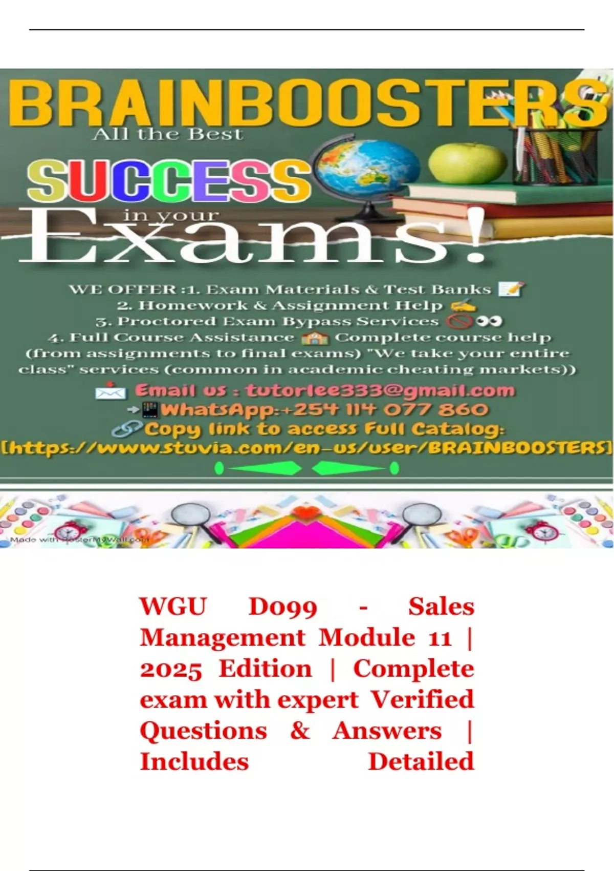 WGU D099 | Sales Management | Module 11 | 2025 Edition | Complete exam with expert Verified Questions & Answers | Includes Detailed Rationales, Case Study Analyses, Key Concept Summaries | Western Governors University Exam | Pass Guarantee | Digital Download