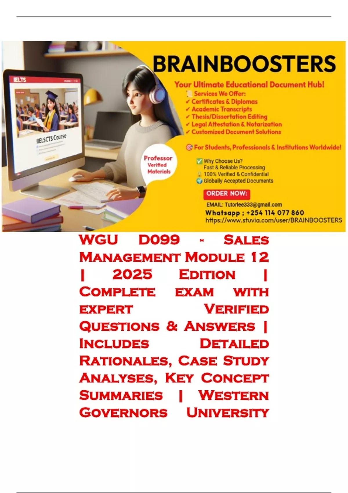 WGU D099 | Sales Management | Module 12 | 2025 Edition | Complete exam with expert Verified Questions & Answers | Includes Detailed Rationales, Case Study Analyses, Key Concept Summaries | Western Governors University Exam | Pass Guarantee | Digital Download