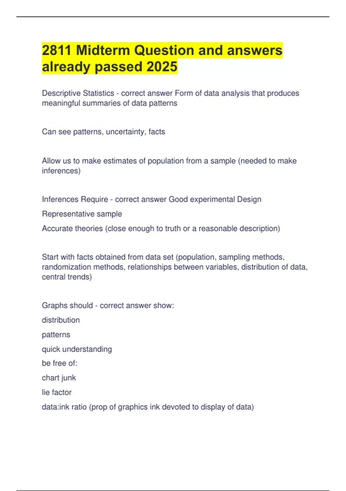 Descriptive Statistics - correct answer Form of data analysis that produces