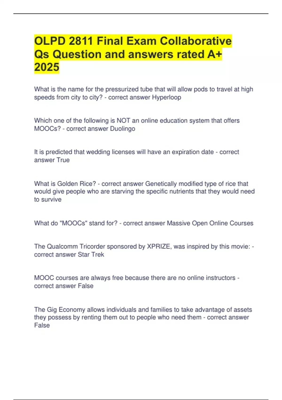 OLPD 2811 Final Exam Collaborative Qs Question and answers rated A+ 2025 What is the name for the pressurized tube that will allow pods to travel at high speeds from city to city? - correct answer Hyperloop Which one of the following is NOT an online education system that offers MOOCs? - correct answer Duolingo It is predicted that wedding licenses will have an expiration date - correct answer True What is Golden Rice? - correct answer Genetically modified type of rice that would give people who are starving the specific nutrients that they would need to survive What do "MOOCs" stand for? - correct answer Massive Open Online Courses The Qualcomm Tricorder sponsored by XPRIZE, was inspired by this movie: - correct answer Star Trek MOOC courses are always free because there are no online instructors - correct answer False The Gig Economy allows individuals and families to take advantage of assets they possess by renting them out to people who need them - correct answer False What issue(s) wer