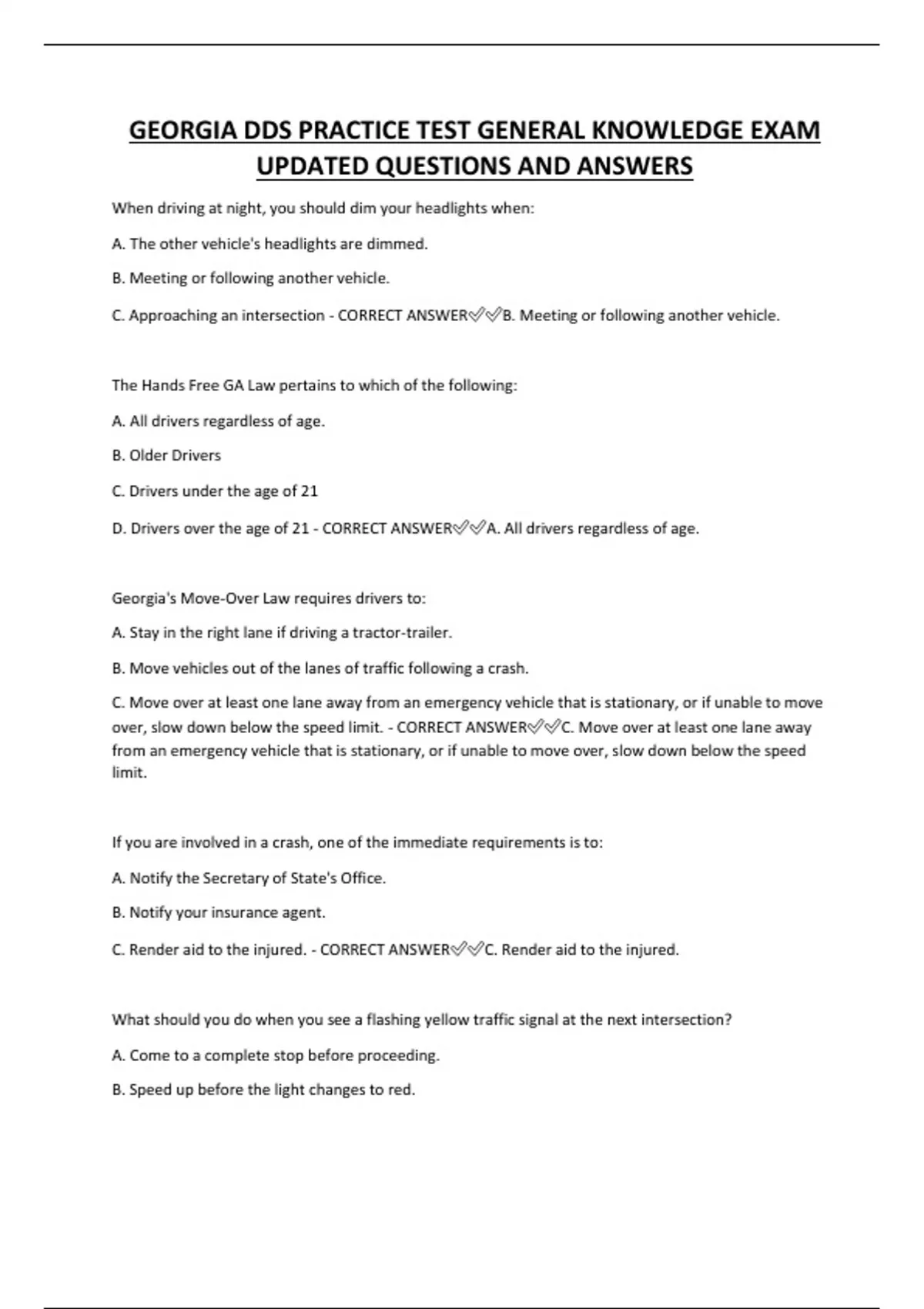 GEORGIA DDS PRACTICE TEST EXAM QUESTIONS AND ANSWERS When driving at night, you should dim your headlights when: - The other vehicle's headlights are dimmed. - Meeting or following another vehicle. - Approaching an intersection - CORRECT ANSWERMeeting or following another vehicle.