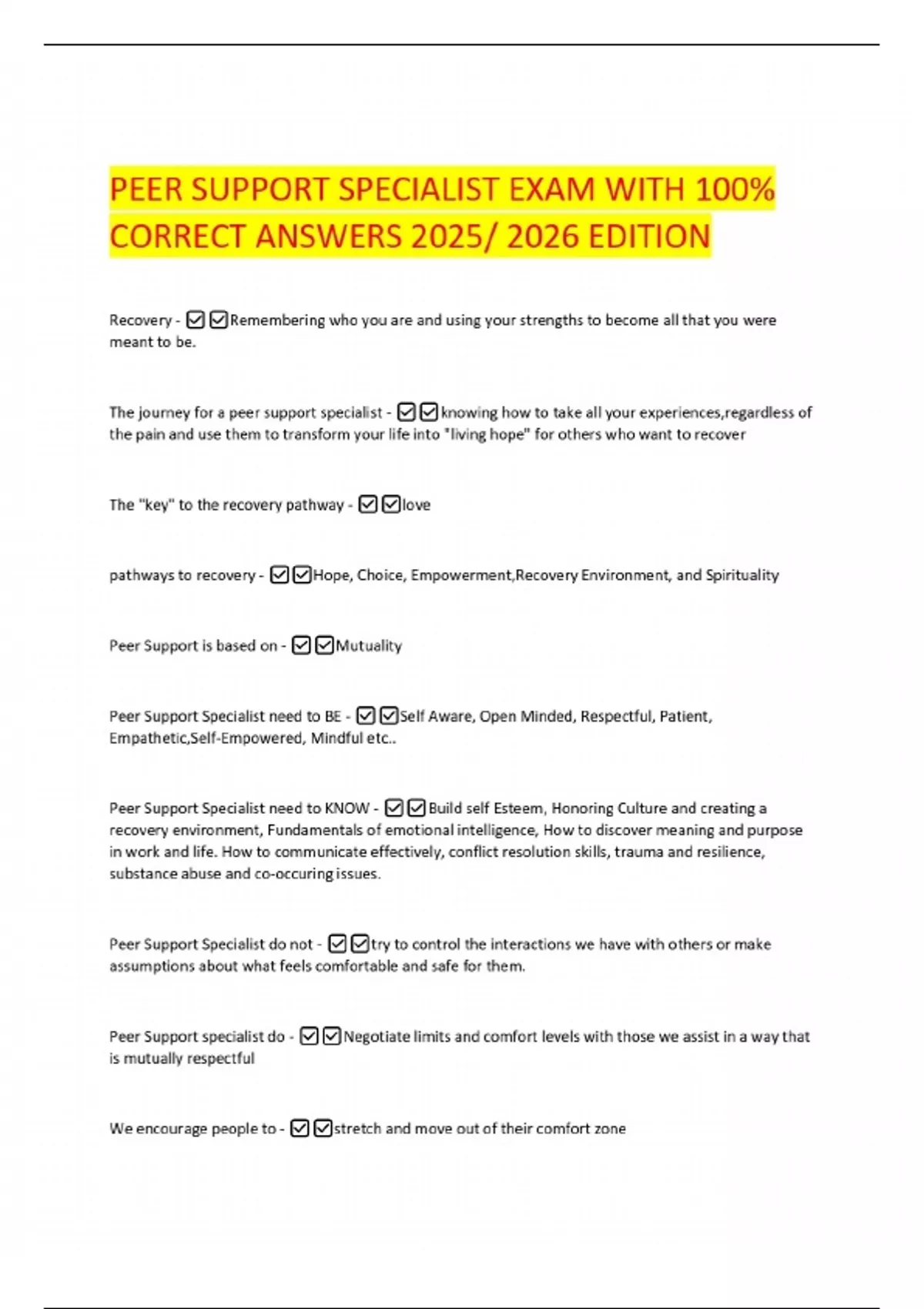 PEER SUPPORT SPECIALIST EXAM WITH 100% CORRECT ANSWERS 2025/ 2026 EDITION Recovery -Remembering who you are and using your strengths to become all that you were meant to be. The journey for a peer support specialist -knowing how to take all your experiences,regardless of the pain and use them to transform your life into "living hope" for others who want to recover The "key" to the recovery pathway -love pathways to recovery -Hope, Choice, Empowerment,Recovery Environment, and Spirituality Peer Support is based on -Mutuality Peer Support Specialist need to BE -Self Aware, Open Minded, Respectful, Patient, Empathetic,Self-Empowered, Mindful etc.. Peer Support Specialist need to KNOW -Build self Esteem, Honoring Culture and creating a