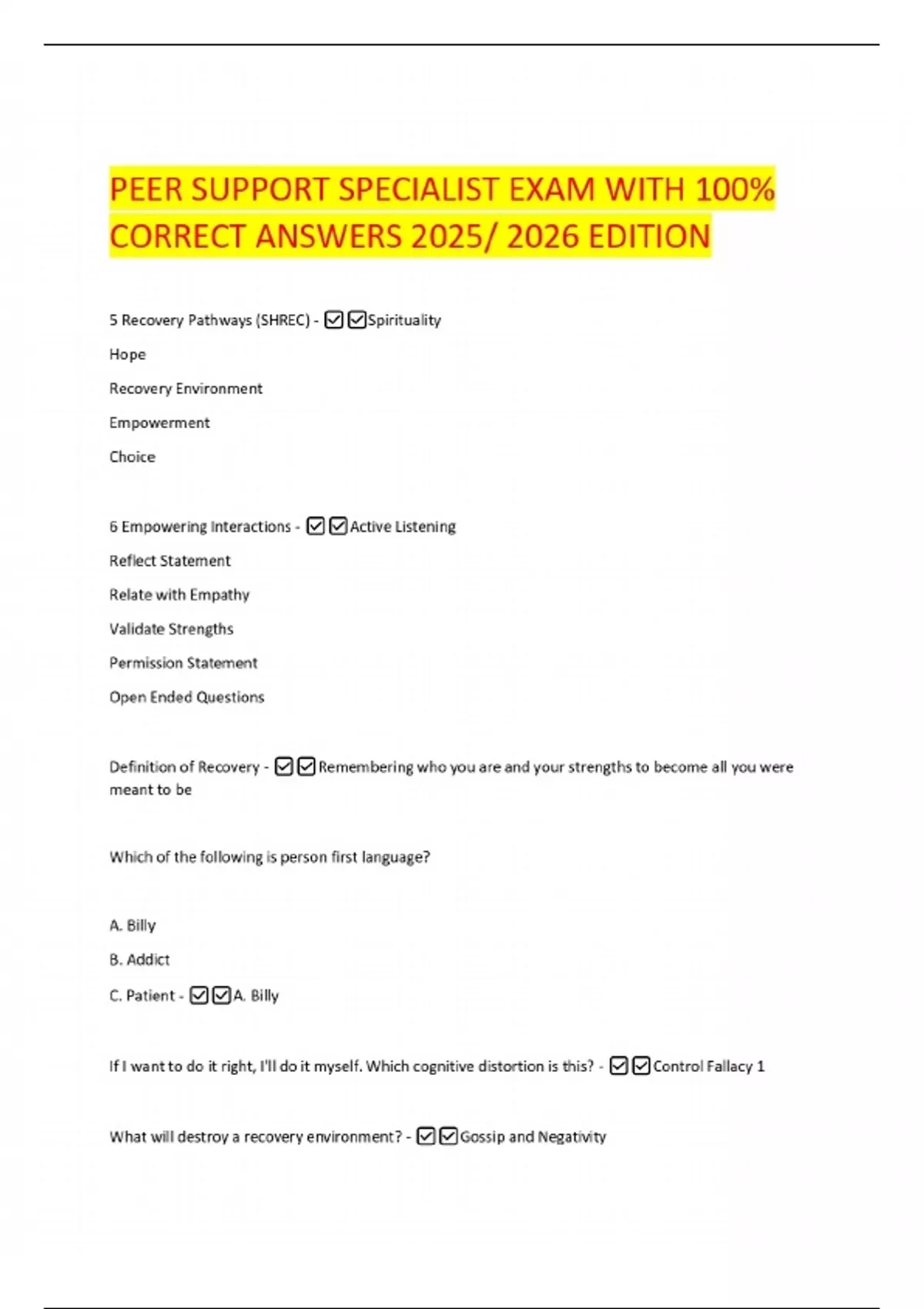 PEER SUPPORT SPECIALIST EXAM WITH 100% CORRECT ANSWERS 2025/ 2026 EDITION