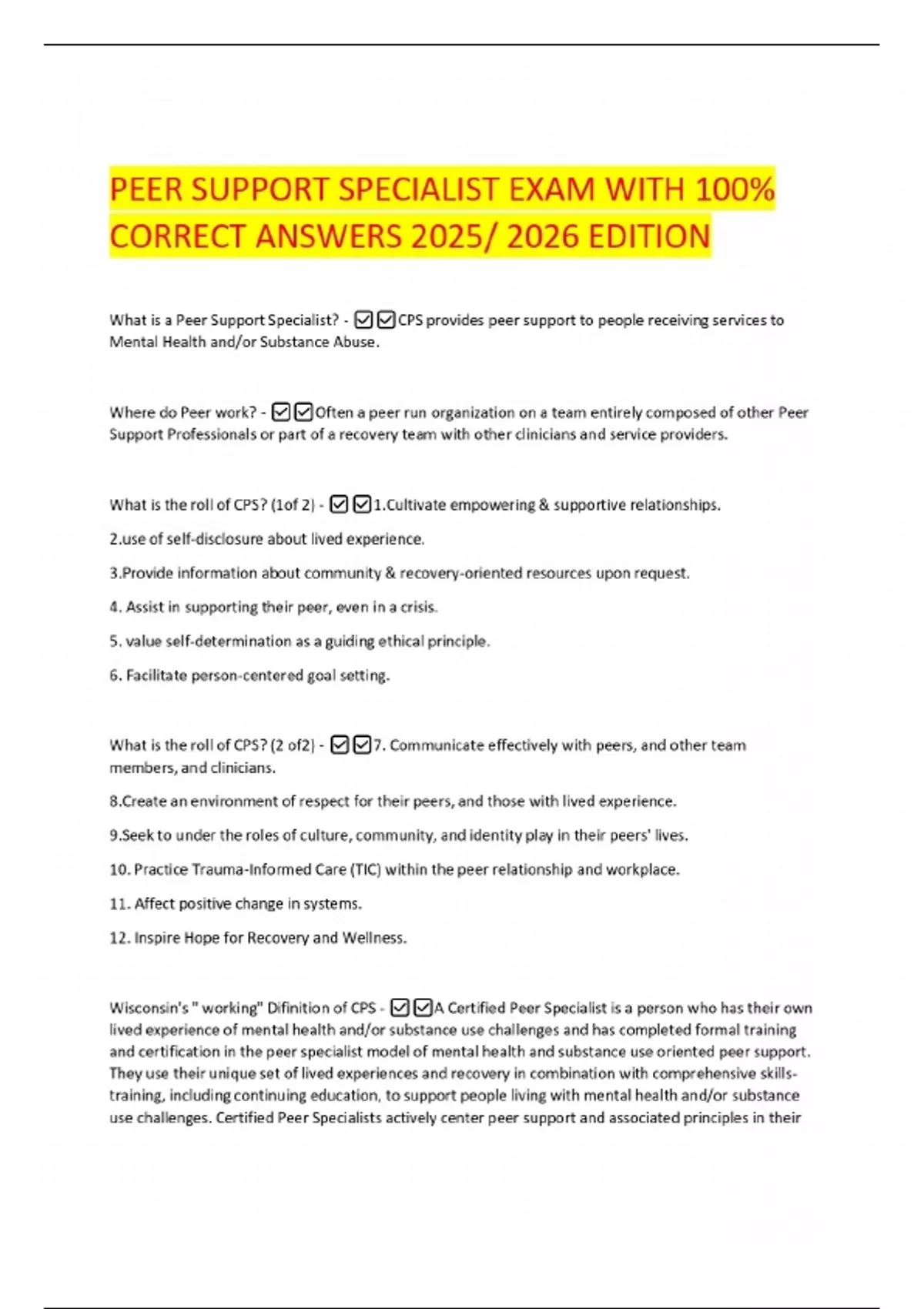 PEER SUPPORT SPECIALIST EXAM WITH 100% CORRECT ANSWERS 2025/ 2026 EDITION What is a Peer Support Specialist? -CPS provides peer support to people receiving services to Mental Health and/or Substance Abuse. Where do Peer work? -Often a peer run organization on a team entirely composed of other Peer Support Professionals or part of a recovery team with other clinicians and service providers. What is the roll of CPS? (1of 2) -1.Cultivate empowering & supportive relationships. of self-disclosure about lived experience. 3.Provide information about community & recovery-oriented resources upon request. 4. Assist in supporting their peer, even in a crisis. 5. value self-determination as a guiding ethical principle. 6. Facilitate person-centered goal setting. What is the roll of CPS? (2 of2) -7. Communicate effectively with peers, and other team members, and clinicians. 8.Create an environment of respect for their peers, and those with lived experience.