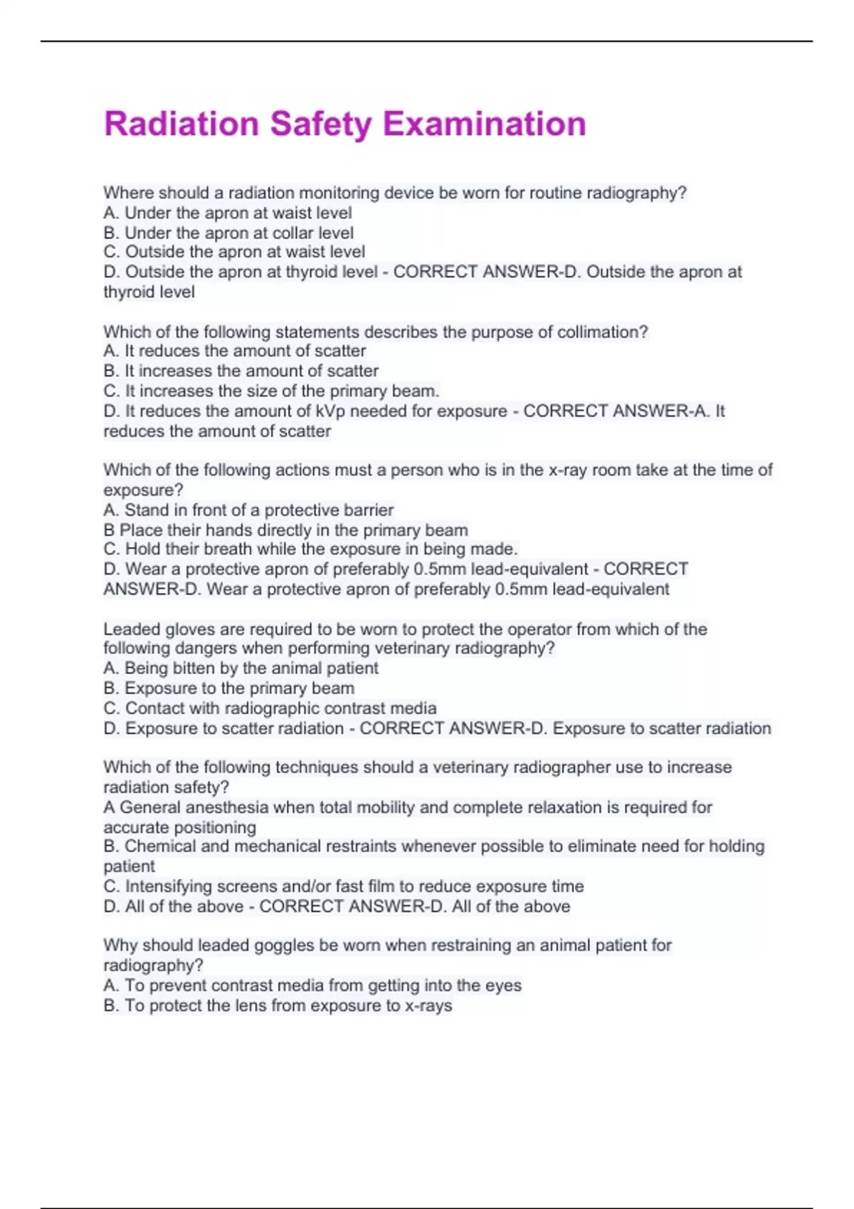 Where should a radiation monitoring device be worn for routine radiography? A. Under the apron at waist level B. Under the apron at collar level C. Outside the apron at waist level D. Outside the apron at thyroid level - CORRECT ANSWER-D. Outside the apron at thyroid level Which of the following statements describes the purpose of collimation? A. It reduces the amount of scatter B. It increases the amount of scatter C. It increases the size of the primary beam. D. It reduces the amount of kVp needed for exposure - CORRECT ANSWER-A. It reduces the amount of scatter Which of the following actions must a person who is in the x-ray room take at the time of exposure? A. Stand in front of a protective barrier B Place their hands directly in the primary beam C. Hold their breath while the exposure in being made. D. Wear a protective apron of preferably 0.5mm lead-equivalent - CORRECT ANSWER-D. Wear a protective apron of preferably 0.5mm lead-equivalent Leaded gloves are required to be worn to protect the operator from which of the following dangers when performing veterinary radiography? A. Being bitten by the animal patient B. Exposure to the primary beam C. Contact with radiographic contrast media D. Exposure to scatter radiation - CORRECT ANSWER-D. Exposure to scatter radiation Which of the following techniques should a veterinary radiographer use to increase radiation safety? A General anesthesia when total mobility and complete relaxation is required for accurate positioning B. Chemical and mechanical restraints whenever possible to eliminate need for holding patient C. Intensifying screens and/or fast film to reduce exposure time D. All of the above - CORRECT ANSWER-D. All of the above