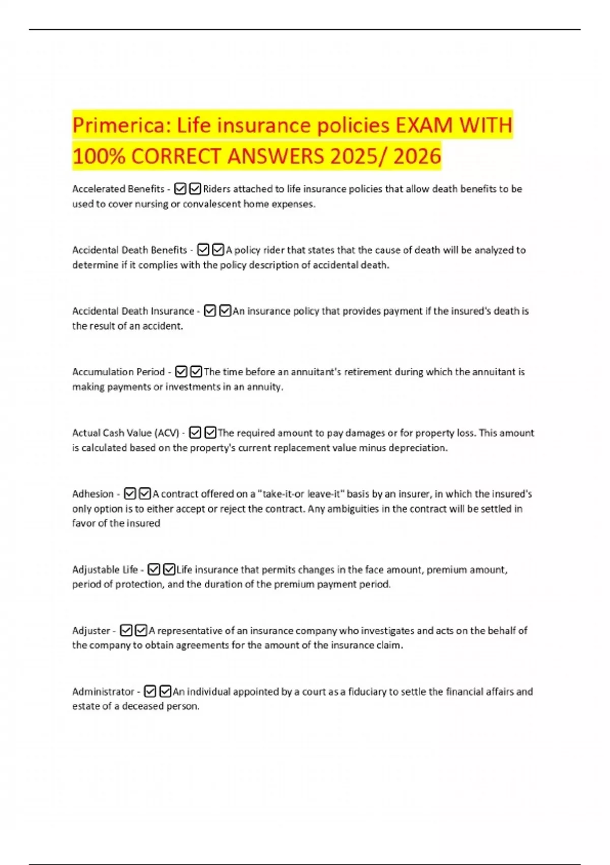 Primerica: Life insurance policies EXAM WITH 100% CORRECT ANSWERS 2025/ 2026 Accelerated Benefits -Riders attached to life insurance policies that allow death benefits to be used to cover nursing or convalescent home expenses. Accidental Death Benefits -A policy rider that states that the cause of death will be analyzed to determine if it complies with the policy description of accidental death. Accidental Death Insurance -An insurance policy that provides payment if the insured's death is the result of an accident. Accumulation Period -The time before an annuitant's retirement during which the annuitant is making payments or investments in an annuity. Actual Cash Value (ACV) -The required amount to pay damages or for property loss. This amount is calculated based on the property's current replacement value minus depreciation. Adhesion -A contract offered on a "take-it-or leave-it" basis by an insurer, in which the insured's only option is to either acce