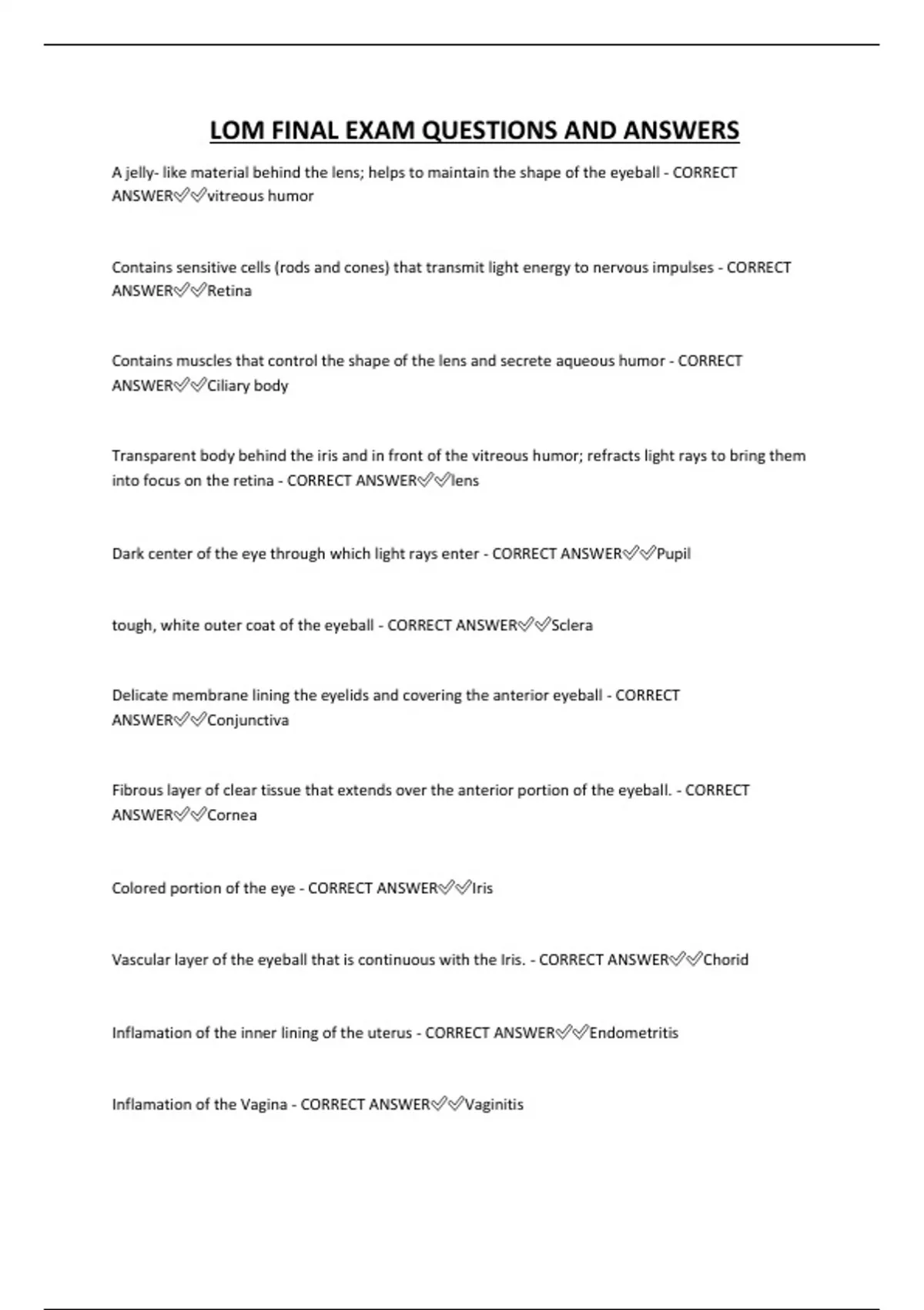 LOM FINAL EXAM QUESTIONS AND ANSWERS A jelly- like material behind the lens; helps to maintain the shape of the eyeball - CORRECT ANSWERvitreous humor