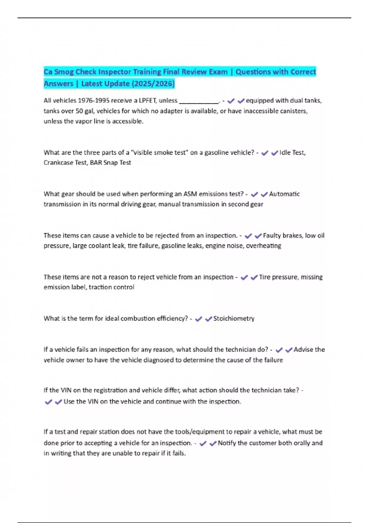 Ca Smog Check Inspector Training Final Review Exam | Questions with Correct Answers | Latest Update (2025/2026)