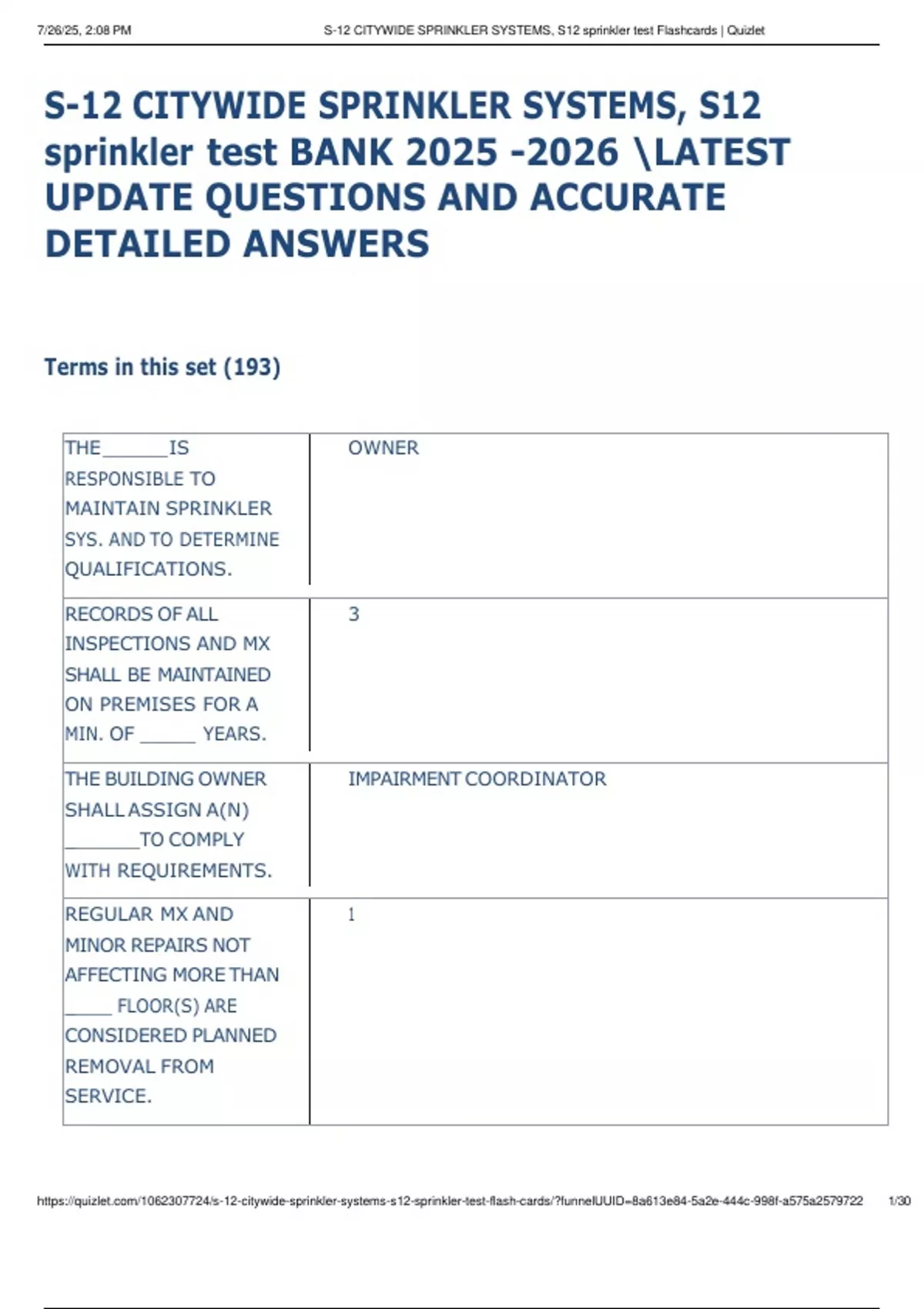 , 7/26/25, 2:08 PM S-12 CITYWIDE SPRINKLER SYSTEMS, S12 sprinkler test Flashcards | Quizlet