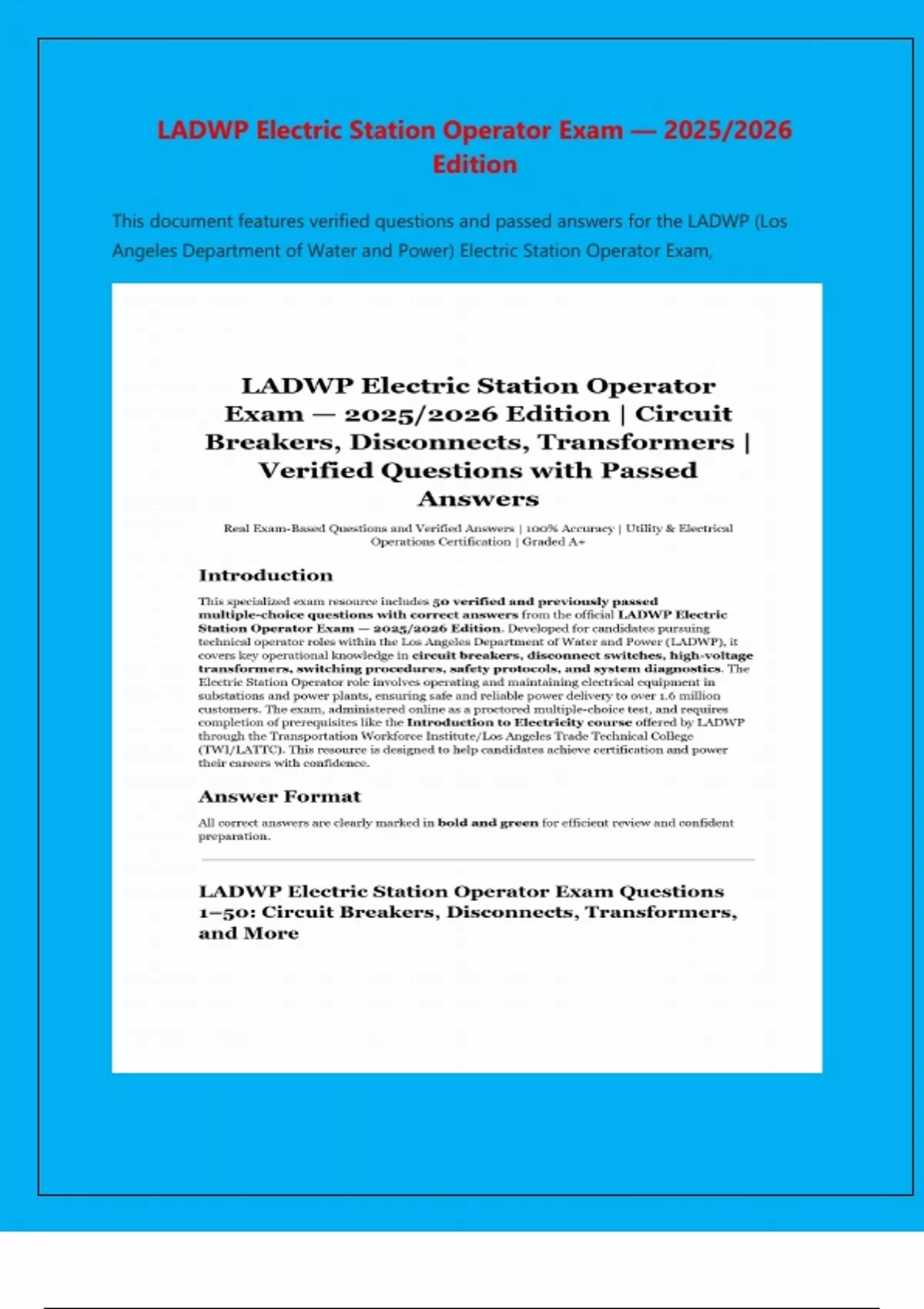 LADWP Electric Station Operator Exam — 2025/2026 Edition This document features verified questions and passed answers for the LADWP (Los Angeles Department of Water and Power) Electric Station Operator Exam,