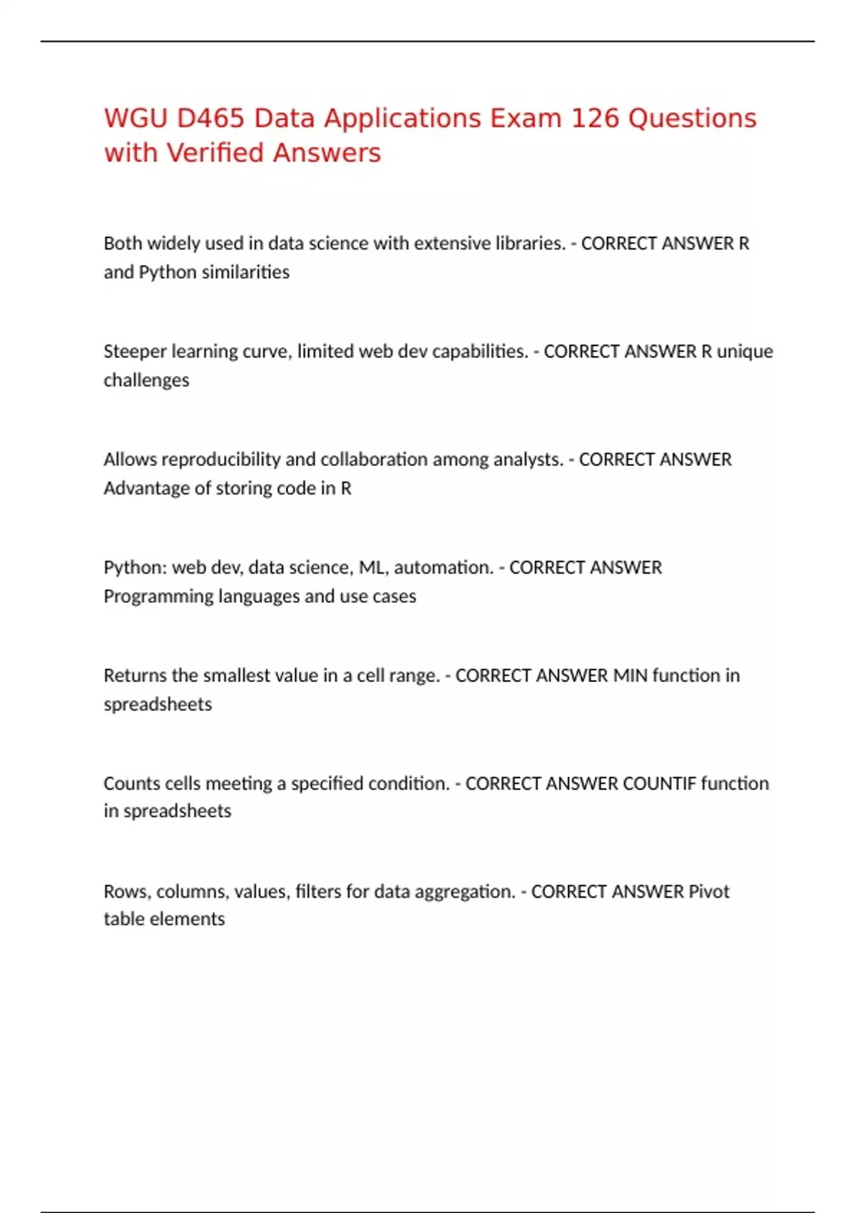WGU D465 Data Applications Exam 126 Questions with Verified Answers Both widely used in data science with extensive libraries. - CORRECT ANSWER R and Python similarities Steeper learning curve, limited web dev capabilities. - CORRECT ANSWER R unique challenges Allows reproducibility and collaboration among analysts. - CORRECT ANSWER Advantage of storing code in R Python: web dev, data science, ML, automation. - CORRECT ANSWER Programming languages and use cases Returns the smallest value in a cell range. - CORRECT ANSWER MIN function in spreadsheets Counts cells meeting a specified condition. - CORRECT ANSWER COUNTIF function in spreadsheets Rows, columns, values, filters for data aggregation. - CORRECT ANSWER Pivot table elements Retrieves data from one or more database tables. - CORRECT ANSWER SELECT command in SQL INNER, LEFT, RIGHT, FULL OUTER JOIN types. - CORRECT ANSWER JOIN commands in SQL