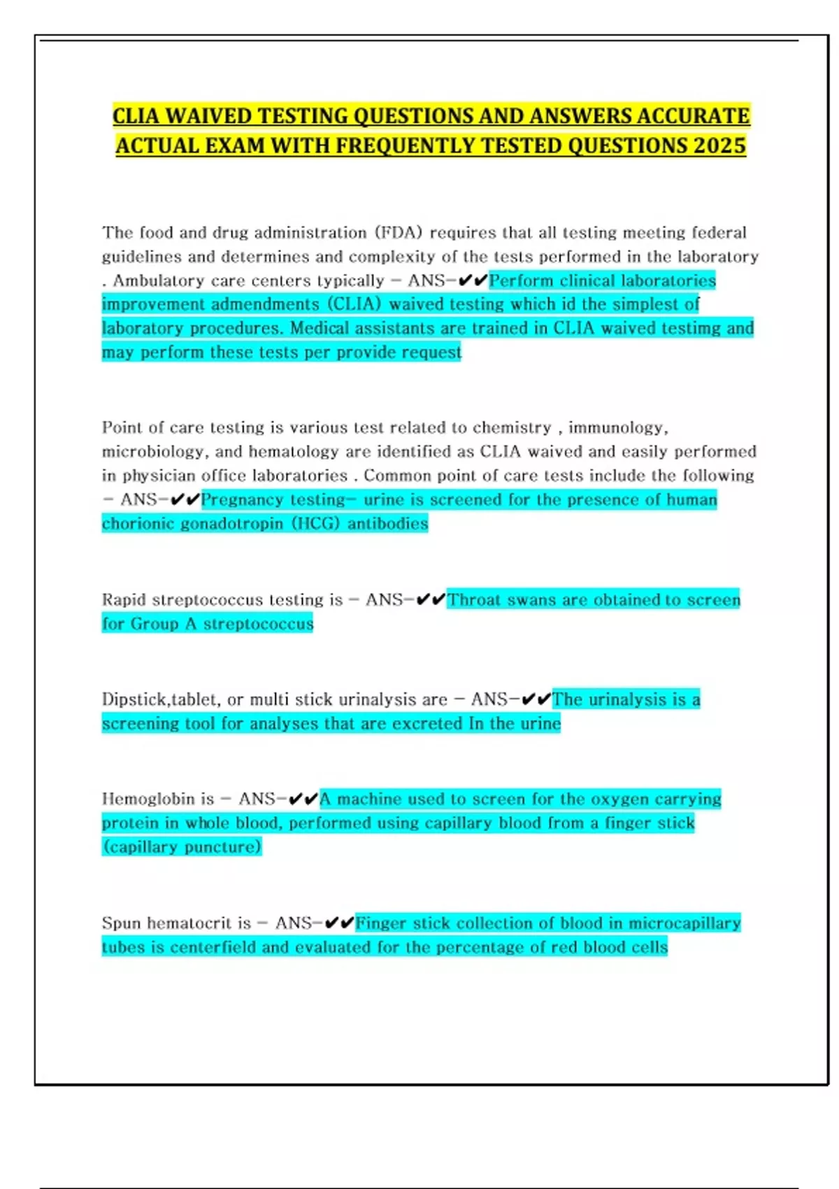 CLIA WAIVED TESTING QUESTIONS AND ANSWERS ACCURATE ACTUAL EXAM WITH FREQUENTLY TESTED QUESTIONS 2025 The food and drug administration (FDA) requires that all testing meeting federal guidelines and determines and complexity of the tests performed in the laboratory . Ambulatory care centers typically - ANS-Perform clinical laboratories improvement admendments (CLIA) waived testing which id the simplest of laboratory procedures. Medical assistants are trained in CLIA waived testimg and may perform these tests per provide request Point of care testing is various test related to chemistry , immunology, microbiology, and hematology are identified as CLIA waived and easily performed in physician office laboratories . Common point of care tests include the following - ANS-Pregnancy testing- urine is screened for the presence of human chorionic gonadotropin (HCG) antibodies Rapid streptococcus testing is - ANS-...
