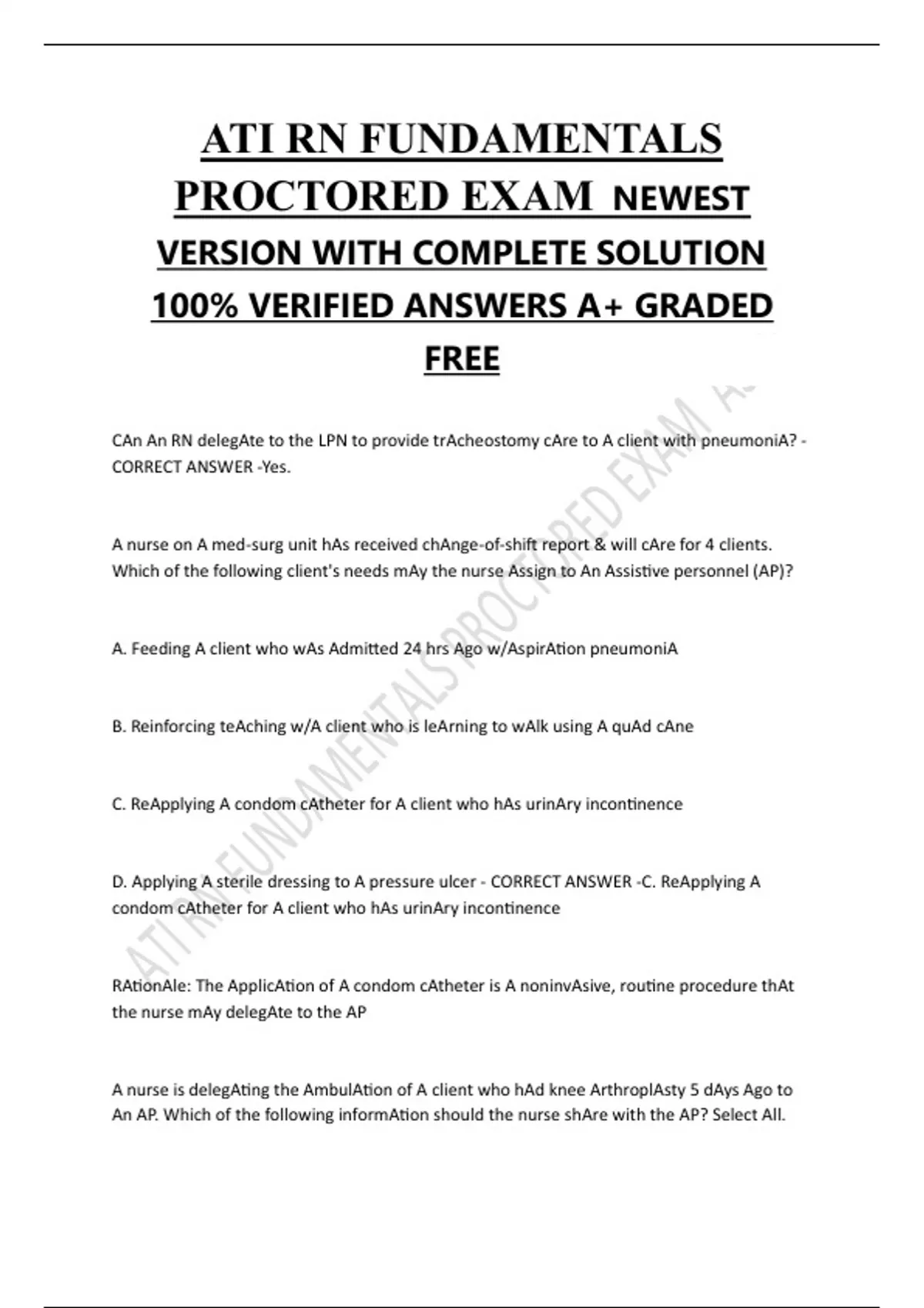 ATI RN FUNDAMENTALS PROCTORED EXAM NEWEST VERSION WITH COMPLETE SOLUTION 100% VERIFIED ANSWERS A+ GRADED FREE CAn An RN delegAte to the LPN to provide trAcheostomy cAre to A client with pneumoniA? - CORRECT ANSWER -Yes. A nurse on A med-surg unit hAs received chAnge-of-shift report & will cAre for 4 clients. Which of the following client's needs mAy the nurse Assign to An Assistive personnel (AP)? A. Feeding A client who wAs Admitted 24 hrs Ago w/AspirAtion pneumoniA B. Reinforcing teAching w/A client who is leArning to wAlk using A quAd cAne C. ReApplying A condom cAtheter for A client who hAs urinAry incontinence D. Applying A sterile dressing to A pressure ulcer - CORRECT ANSWER -C. ReApplying A condom cAtheter for A client who hAs urinAry incontinence RAtionAle: The ApplicAtion of A condom cAtheter is A noninvAsive, routine procedure thAt the nurse mAy delegAte to the AP A nurse is delegAting the AmbulAtion of A client who hAd knee ArthroplAsty 5 dAys Ago to An AP. Which of the following informAtion should the nurse shAre with the AP? Select All.