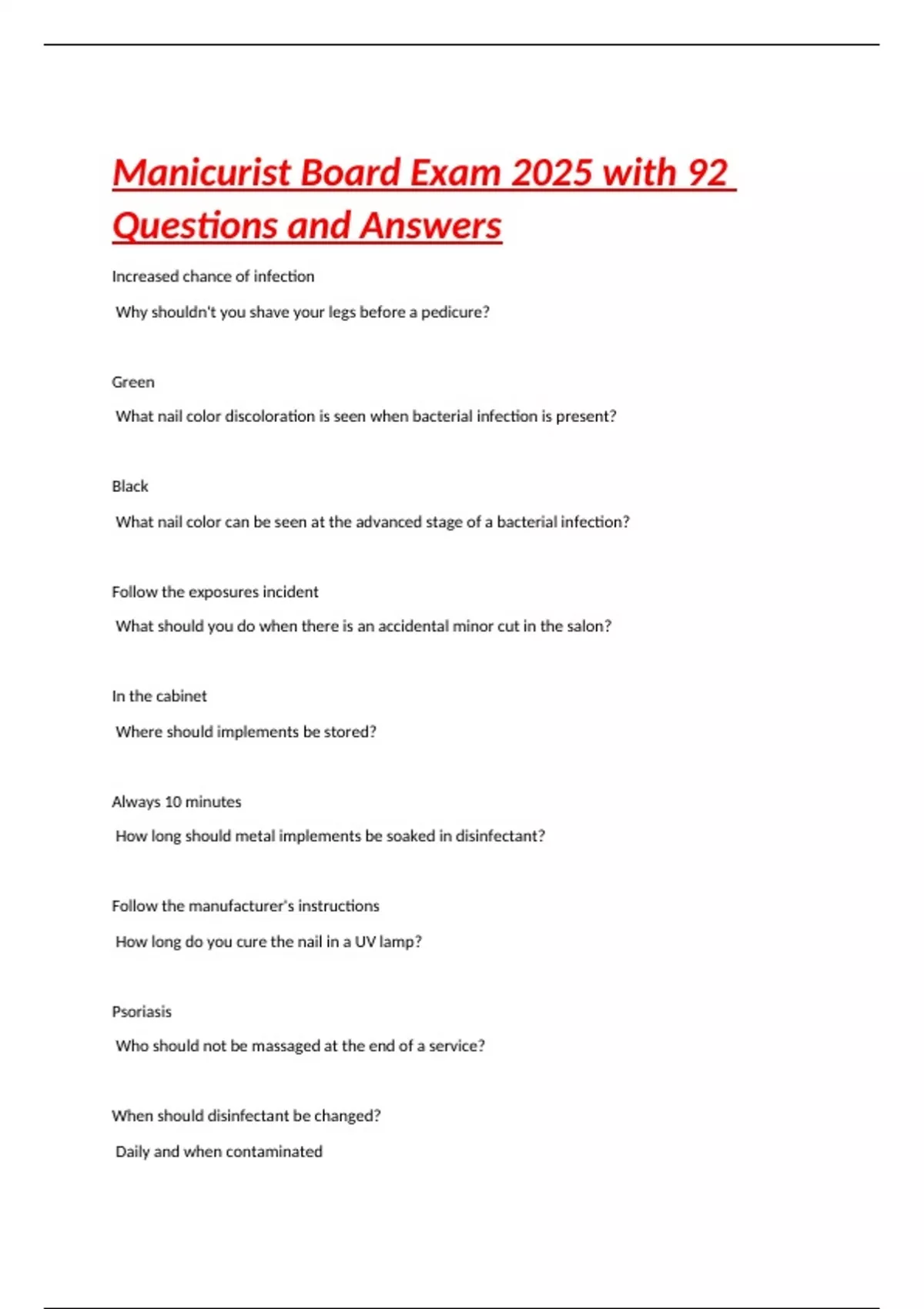 This document contains 92 multiple-choice and short-answer questions with accurate answers for the 2025 Manicurist Board Exam. It covers essential topics such as nail disorders, disinfection procedures, client safety, massage techniques, infection control, nail anatomy, and salon ethics. Ideal for candidates preparing for licensure in the U.S., this resource is designed to align with state board standards and improve practical and theoretical exam readiness.