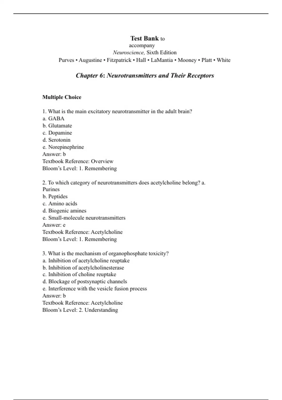 Test Bank to accompany Neuroscience, Sixth Edition BY Purves • Augustine • Fitzpatrick • Hall • LaMantia • Mooney • Platt • White (Chapter 6: Neurotransmitters and Their Receptors)