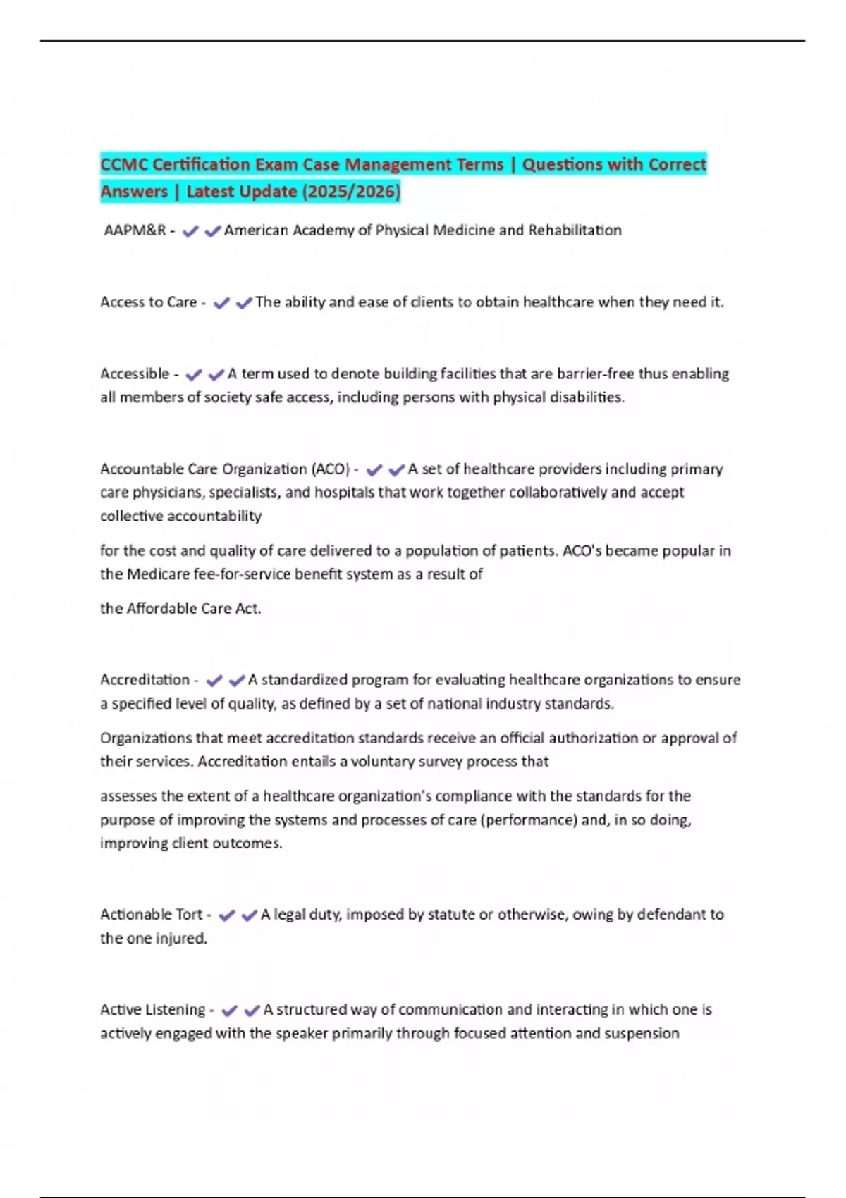 CCMC Certification Exam Case Management Terms | Questions with Correct Answers | Latest Update (2025/2026)