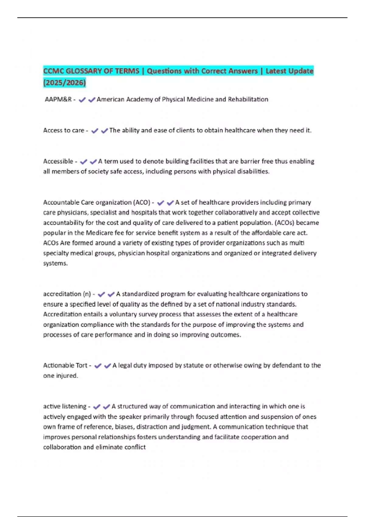 CCMC GLOSSARY OF TERMS | Questions with Correct Answers | Latest Update (2025/2026)