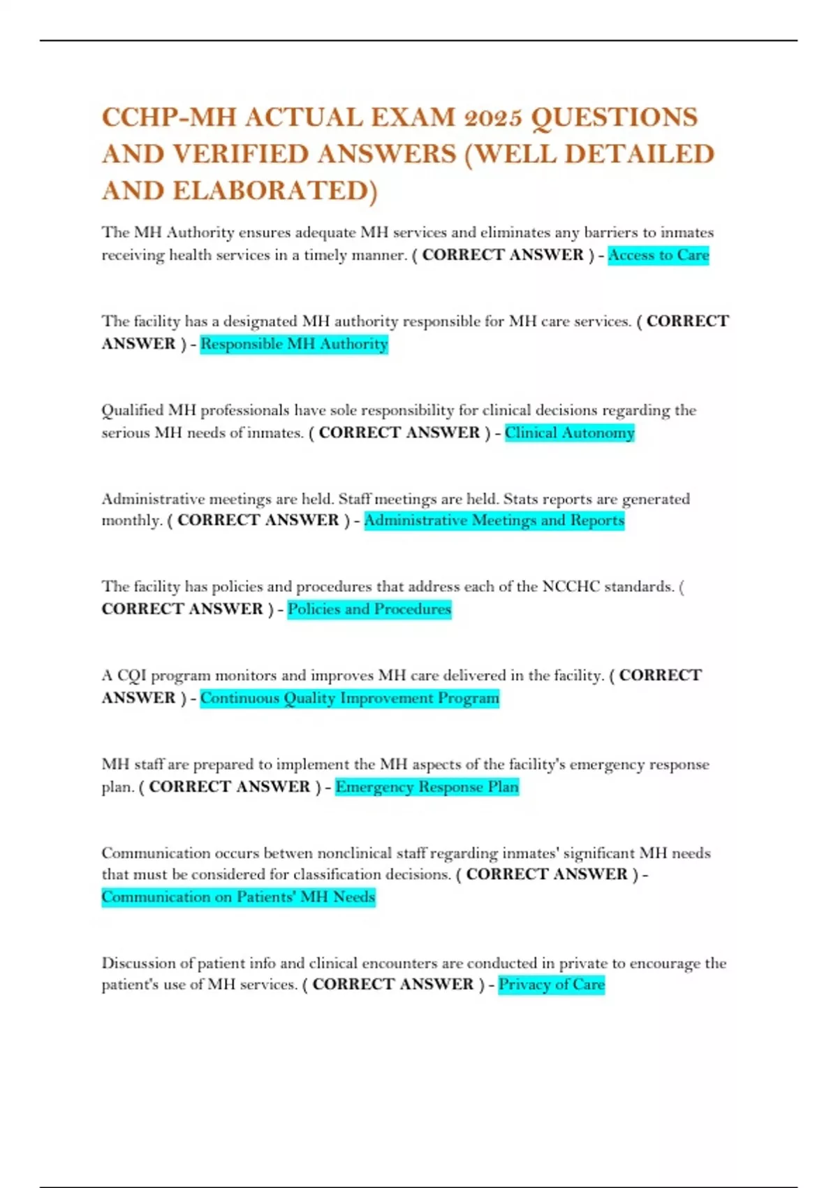 A CQI program monitors and improves MH care delivered in the facility. ( CORRECT