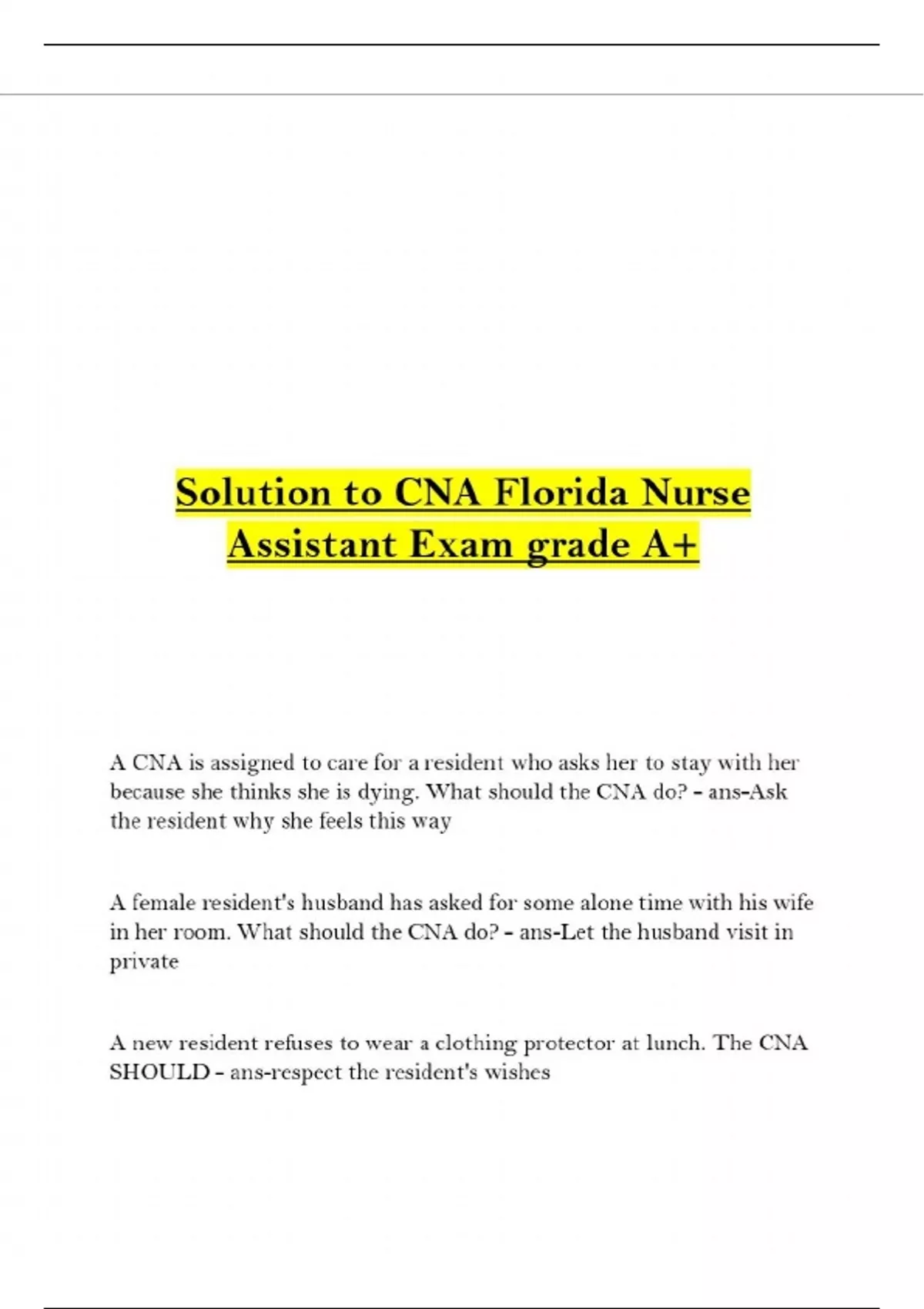 solution to cna florida nurse assistant exam grade