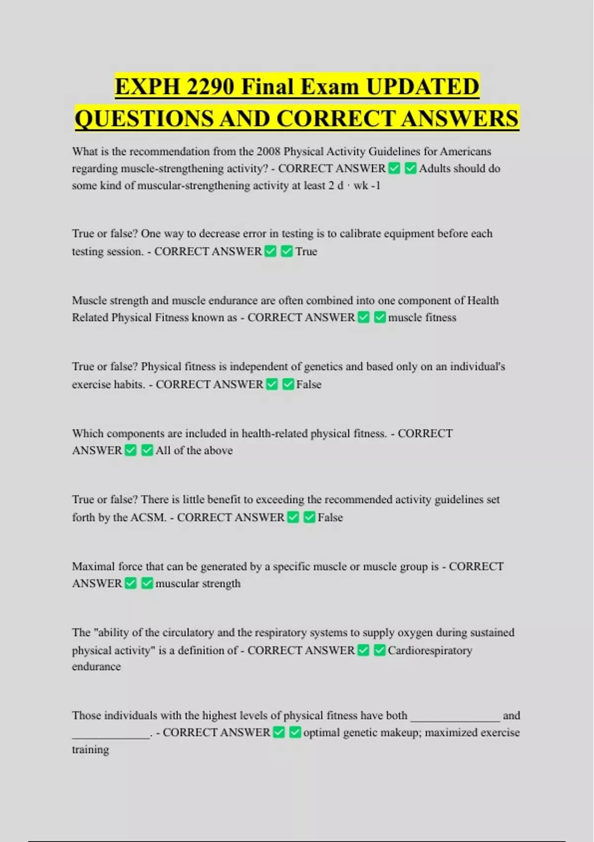 EXPH 2290 Final Exam UPDATED QUESTIONS AND CORRECT ANSWERS What is the recommendation from the 2008 Physical Activity Guidelines for Americans regarding muscle-strengthening activity? - CORRECT ANSWER Adults should do some kind of muscular-strengthening activity at least 2 d · wk -1 True or false? One way to decrease error in testing is to calibrate equipment before each testing session. - CORRECT ANSWER True Muscle strength and muscle endurance are often combined into one component of Health Related Physical Fitness known as - CORRECT ANSWER muscle fitness